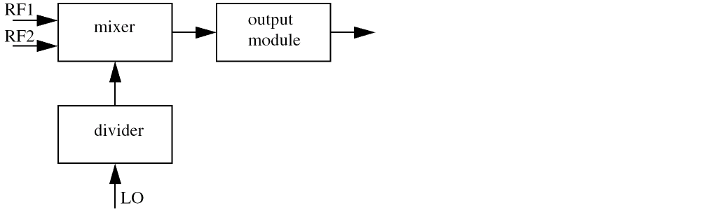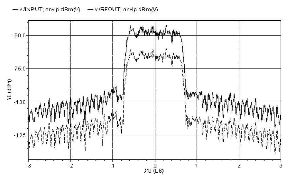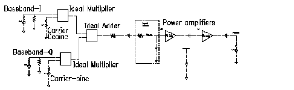 This example simulates the system whose block diagram is shown in Figure 2-36. The system contains a local oscillator and a mixer followed by two power amplifier stages.