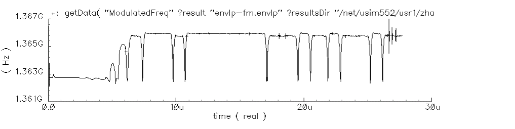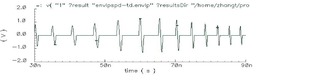 The oscillating frequency is 410 MHz, which corresponds to the period 2.44 nanoseconds. Figure 2-30 shows that there are about 0.1 microseconds between two occasional ENVLP analysis cycles. This implies that about 40 cycles were skipped for each ENVLP analysis step.