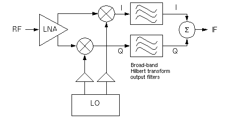 The large RF circuit shown in Figure 3-1 is an image rejection receiver that consists of a low-noise amplifier, a splitting network, two double-balanced mixers, and broad-band Hilbert transform output filter combined with a summing network that is used to suppress the undesired sideband. A limiter in the LO path is used for controlling the amplitude of the LO.