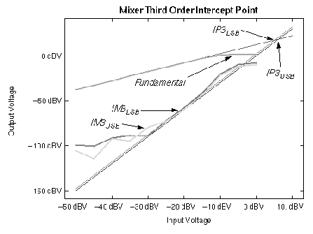 In Figure 3-6, the third-order intercept point of the receiver was computed by extrapolating actual measurements at small-signal levels. The measured result is either 6 or 7 dBV depending on whether the upper or lower sidebands are used. The IM3 curves bend up at low levels due to small levels of numerical error generated by the simulator. This problem could be reduced at the expense of longer simulations and increased memory requirements by tightening simulator tolerances.