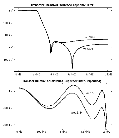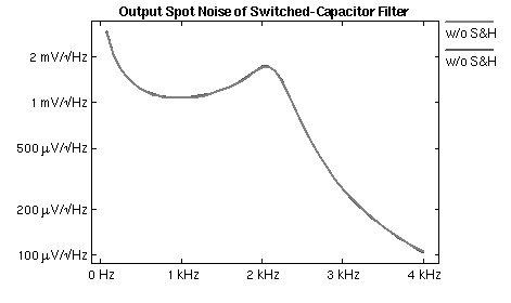 These analyses compute the total spot noise as a function of frequency at the sampled and unsampled outputs. The results are shown in Figure 3-10. They include noise folding (noise being converted down from sidebands of the clock by the sampling nature of the switched-capacitor filter).