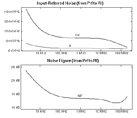 The output noise, input-referred noise, and the noise figure as computed by the PNoise analysis are shown in Figure 3-5. The outpupt noise at V(out) and the input-referred noise from Vrf appear in the top of the figure. The noise figure from Vrf, assuming 50 W source resistance appears in the bottom of the figure. The flicker or 1/f noise of the devices is clearly visible.