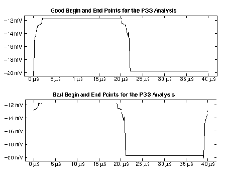 In order to further improve the efficiency of the PSS analysis, the phasing of the clock signals relative to the simulation interval is carefully chosen. It is best to have the simulation interval begin and end at points where the signals are not changing abruptly. For example, the phasing shown in the top half of Figure 3-8 results in convergence in fewer iterations and less time than the phasing shown in the bottom half of the figure. In the top half of the figure, the signal is settled and unchanging immediately prior to the end of the analysis. Contrast this with the situation shown in the lower half of the figure, in which the waveform is changing abruptly at the end point.