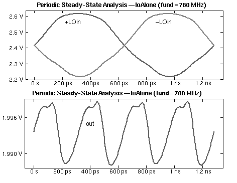 Waveforms computed by this analysis are shown in Figure 3-2. The response of the receiver computed by PSS analysis is loAlone at the LO input and it appears in the top half Figure 3-2. The response of the receiver at the output appears in the bottom half Figure 3-2.