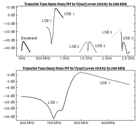 The transfer function from the RF input Vrf to the output voltageV(out) appears in the top half of Figure 3-3. The bottom half of Figure 3-3 is an expanded version of the top that clearly shows the conversion due to the ±1 harmonics of the LO.