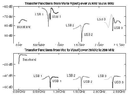 The X axis is labeled with the input frequency (by setting freqaxis to in), although you can also view the transfer functions versus the output frequency (set freqaxis to out). The output frequency range for all of the transfer functions shown is baseband, which is being swept from 20 kHz to 200 lHz. For example, Vrƒ(2) is the transfer function from the second upper sideband to baseband, and finally, Vrƒ(0) is the transfer function from baseband to baseband.