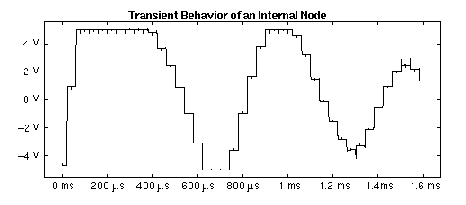 As shown in Figure 3-7, the transient behavior of an internal node in the filter shows clipping that results from using the DC operation point as the initial condition. The clipping causes convergence problems for PSS analysis. Convergence is easily achieved either by setting tstab = 1.5 ms so that the PSS analysis gets beyond the clipping, or setting the initial conditions on the capacitors to zero.