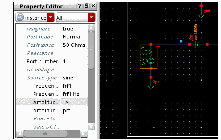 Figure 2-11 RF Voltage Source in lnaSimpleNote that when you select the port, the Property Editor populates with the instance properties on the port. Note that the RF port has a Port Number of 1 and input Resistance of 50 Ohms. Leave the Source type parameter set to
