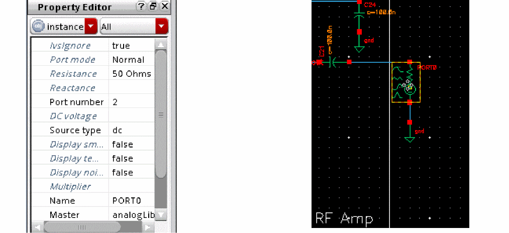 Next, click the port on the right side of the schematic. This is the output port of lnaSimple. The Property Editor shows the instance properties on the output port.