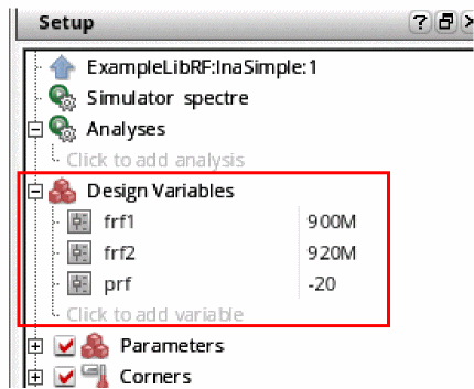 Perform the following steps to set the design variables to the values required for each simulation. The Design Variables section is located in the Setup pane of the ADE Explorer simulation window: