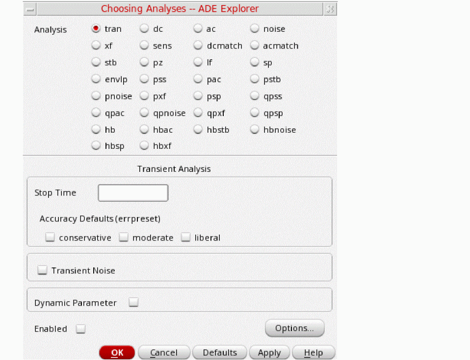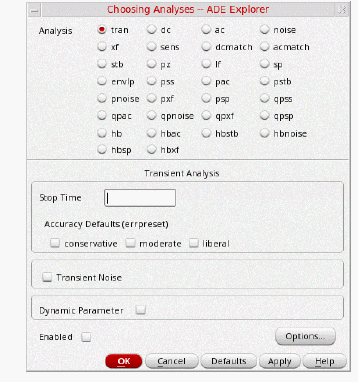 In the ADE Explorer window, select Analysis - Choose or click the Choosing Analyses icon (