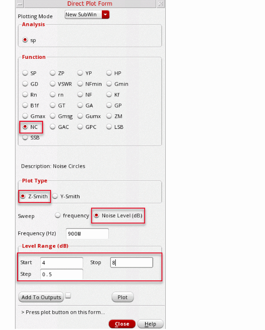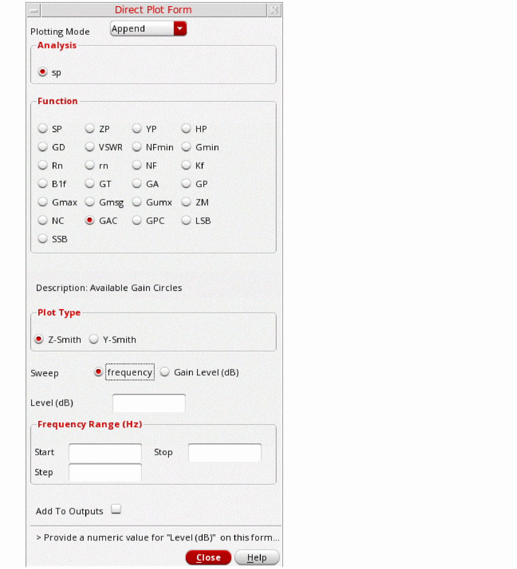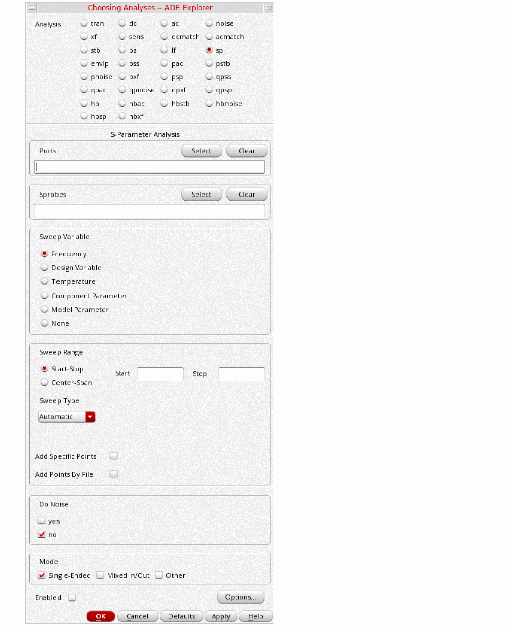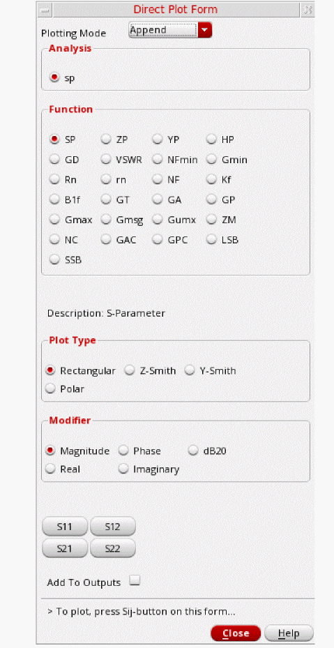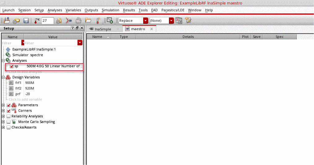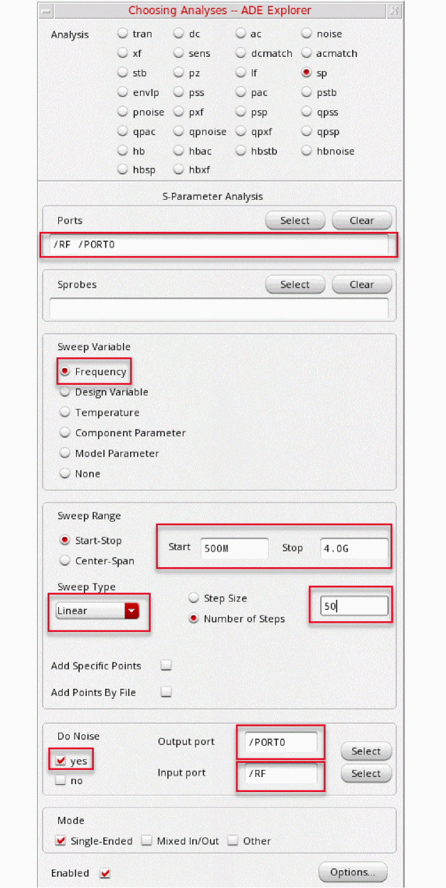 The S-Parameter (sp) analysis is the most useful linear small signal analysis for low noise amplifiers. In this section, you will set up an sp analysis by specifying the input and output ports and the range of sweep frequencies.