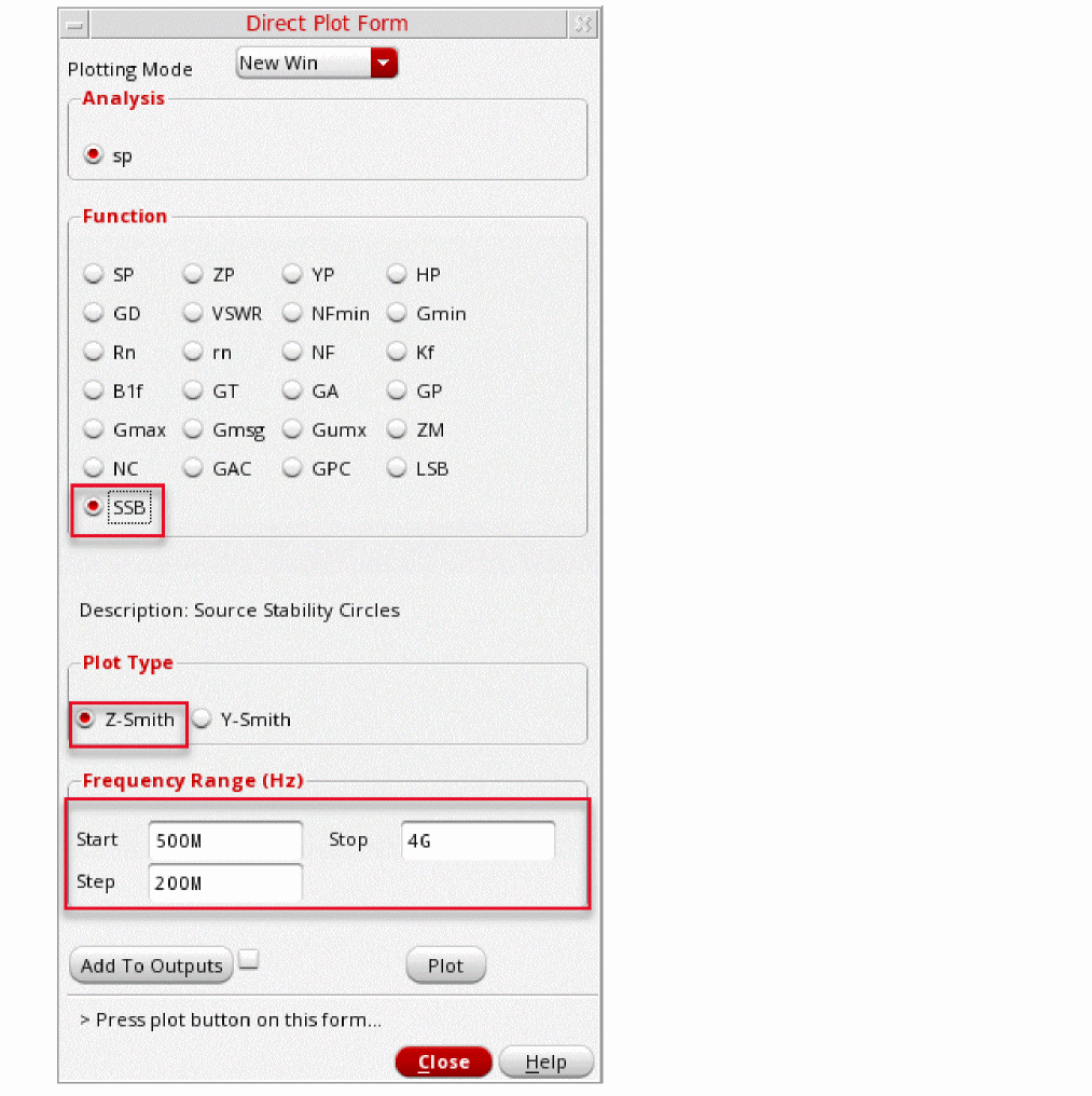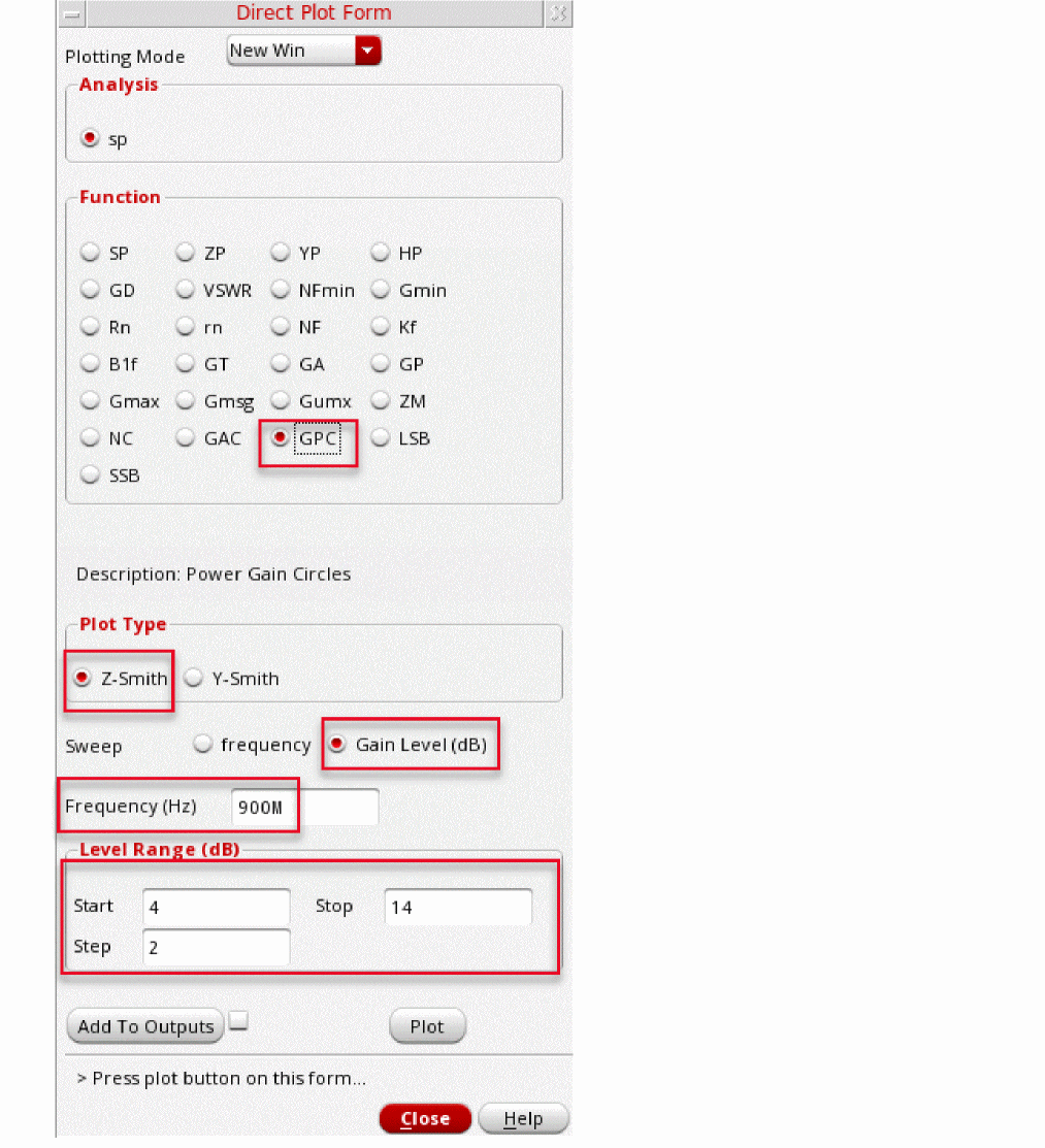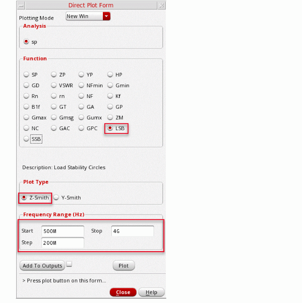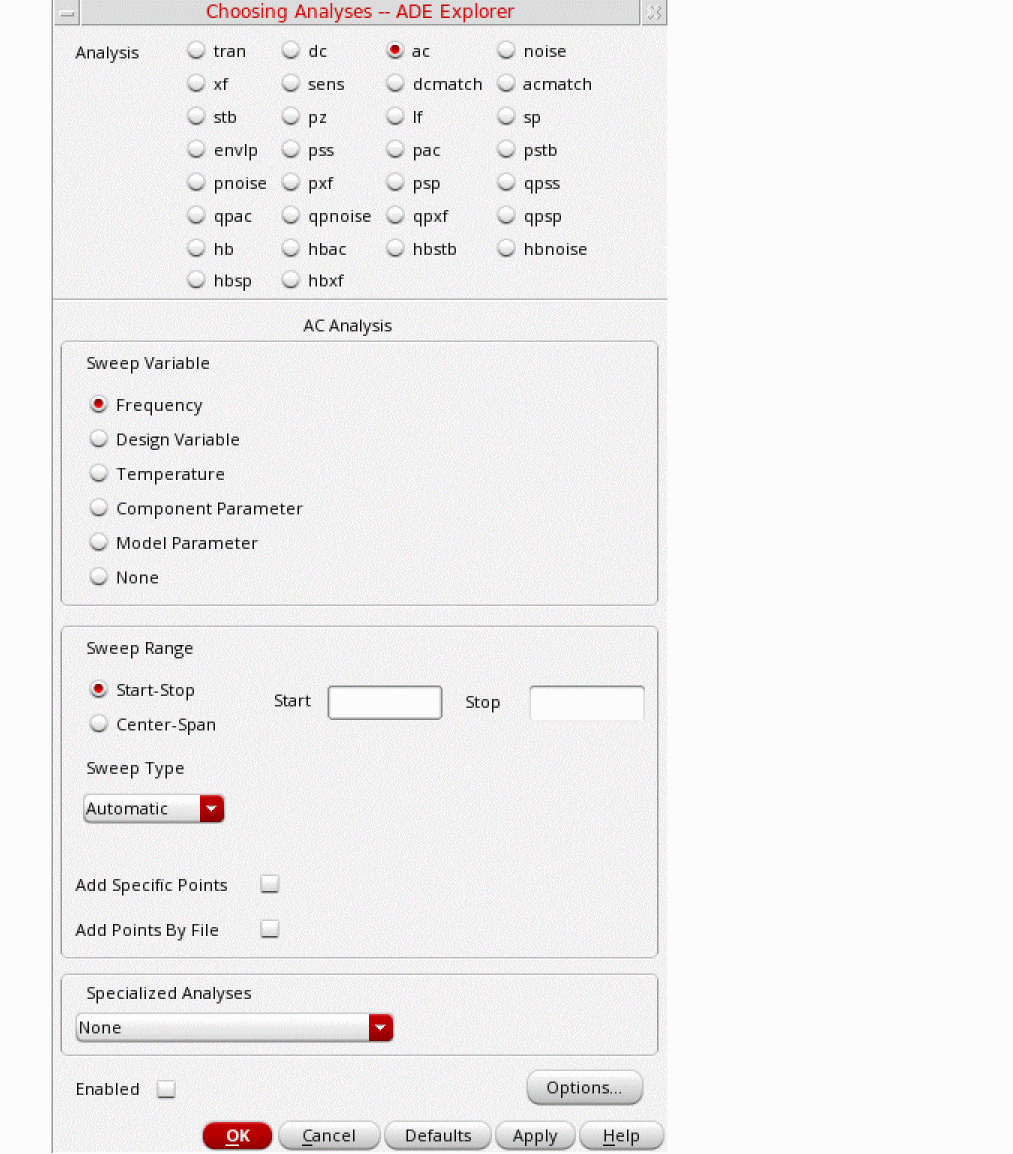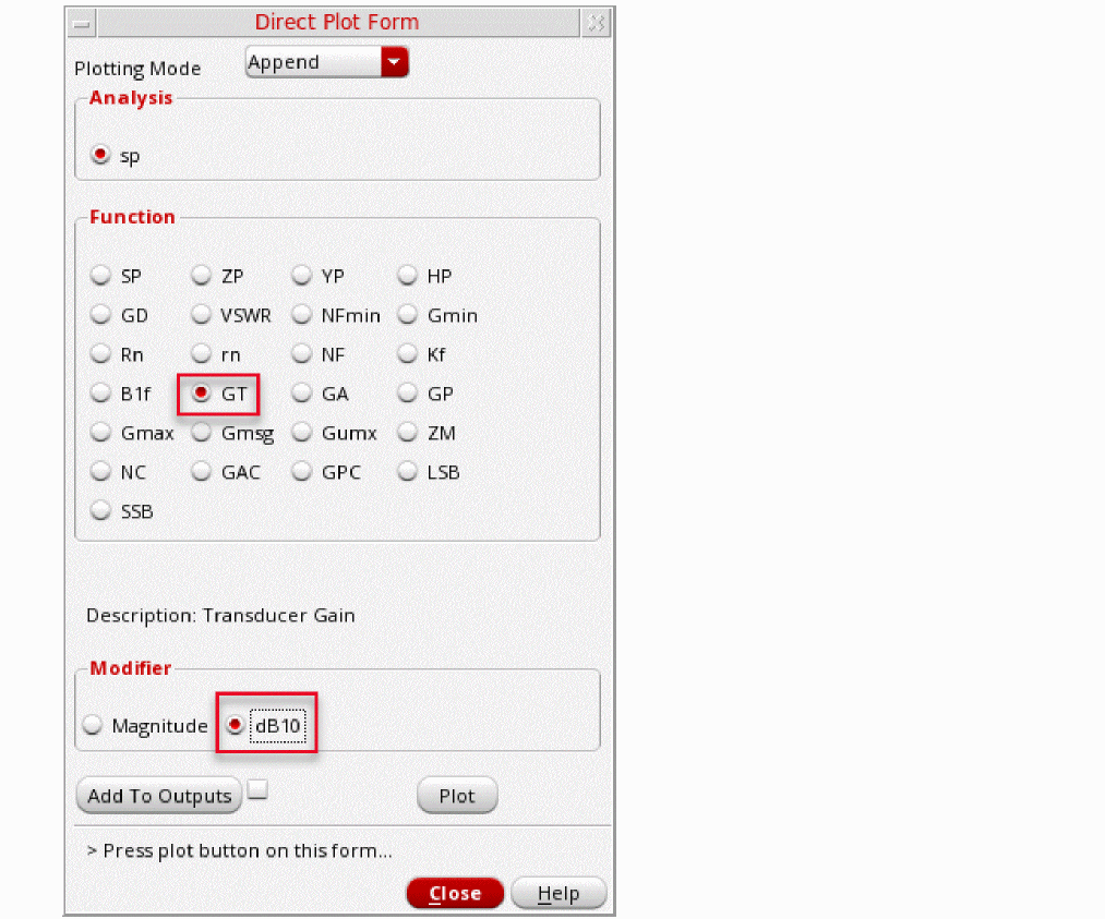 The S-Parameter (sp) analysis is the most useful linear small signal analysis for low noise amplifiers. In this section, you will set up an sp analysis by specifying the input and output ports and the range of sweep frequencies.