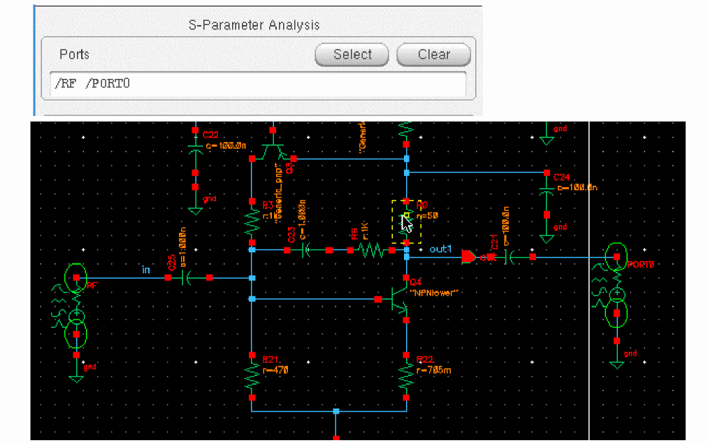 The S-parameter analysis linearizes the circuit about the DC operating point and computes the S-parameters of the circuit taken as an N-port. In the netlist, the port statements define the ports of the circuit. Each active port is turned on sequentially, and a linear small-signal analysis is performed. Spectre converts the response of the circuit at each active port into S-parameters and outputs these parameters. There must be at least one active port statement in the circuit.