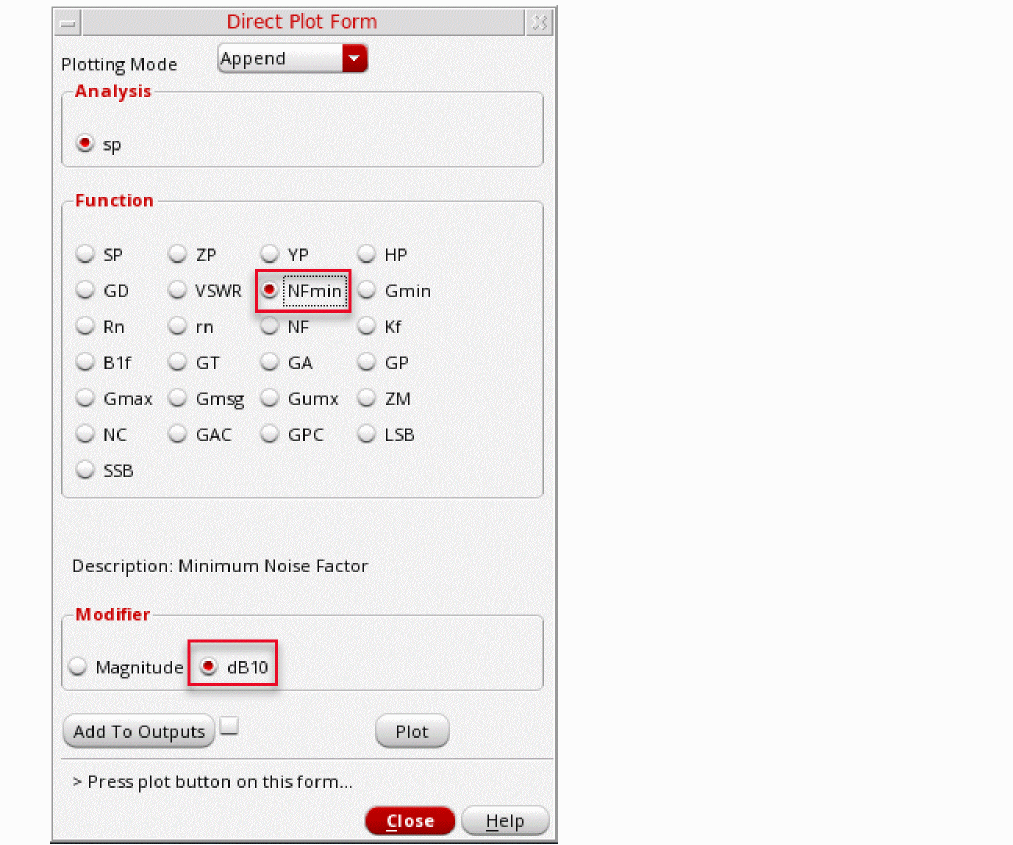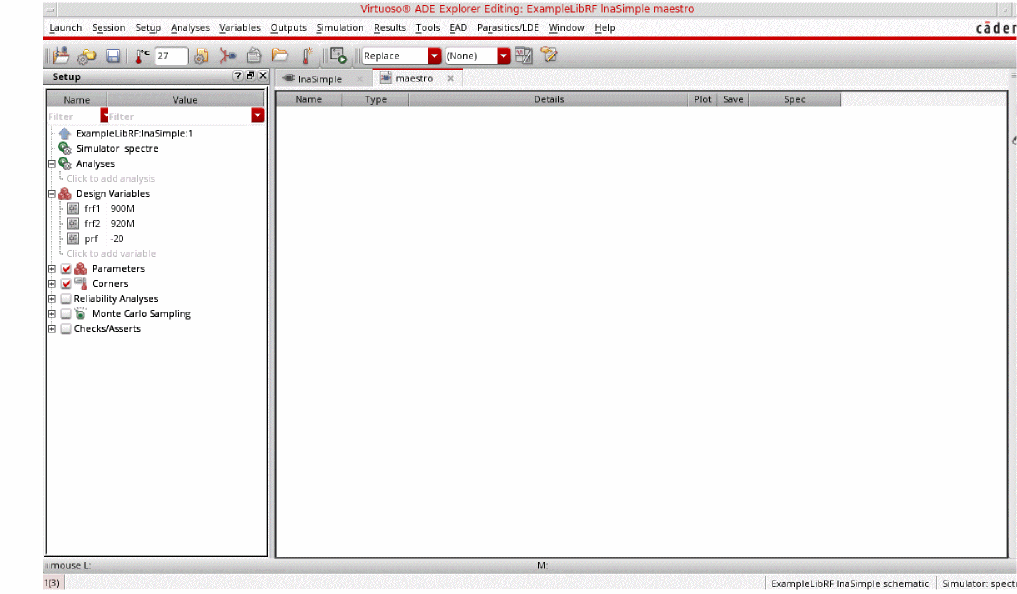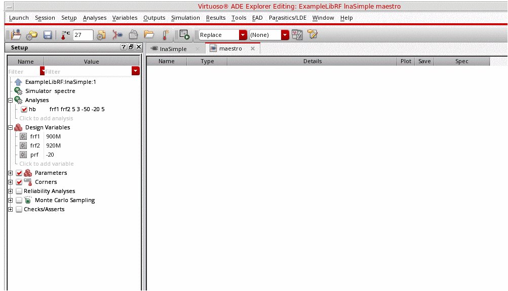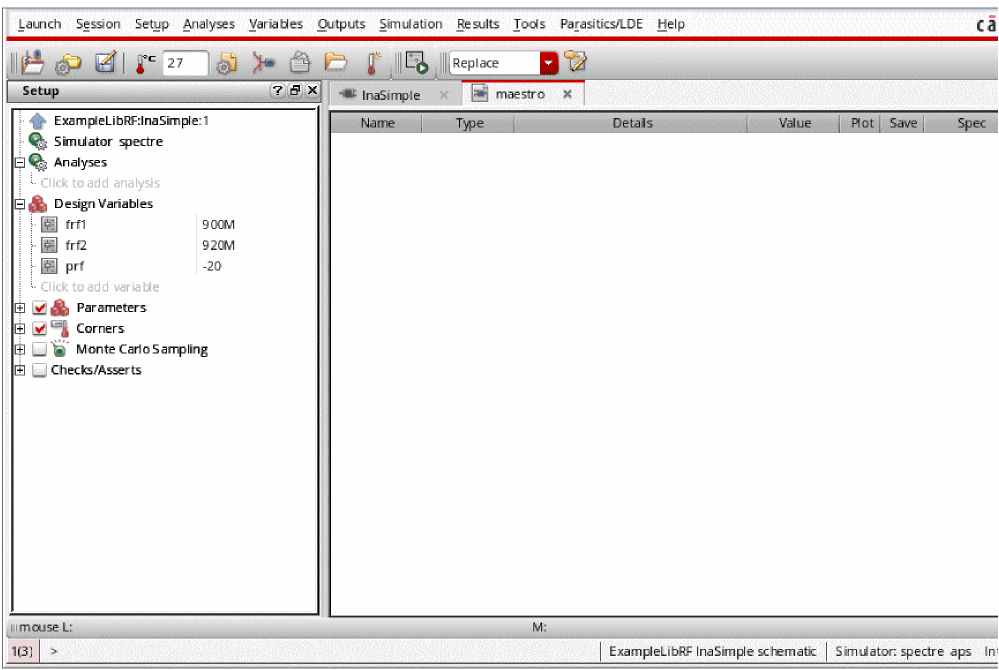 To use this section, you must be familiar with the SpectreRF simulator analyses as well as know about LNA designs. For more information about the SpectreRF simulator analyses, refer to the various chapters in this user guide and also the SpectreRF Simulation Option Theory.