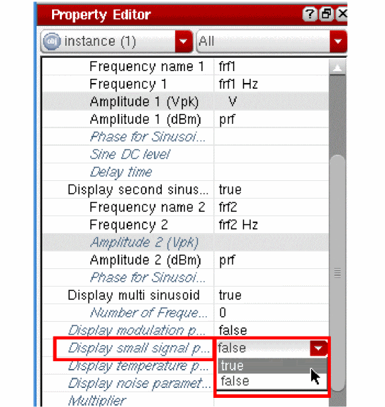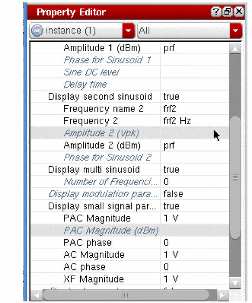 Note that there are two large tones. The frequency names for all large signal tones are automatically populated from the schematic. You viewed the tones earlier when viewing Property Editor for the RF port.