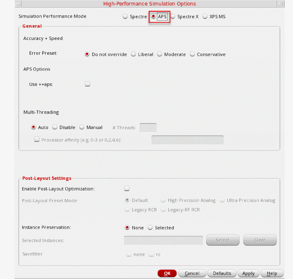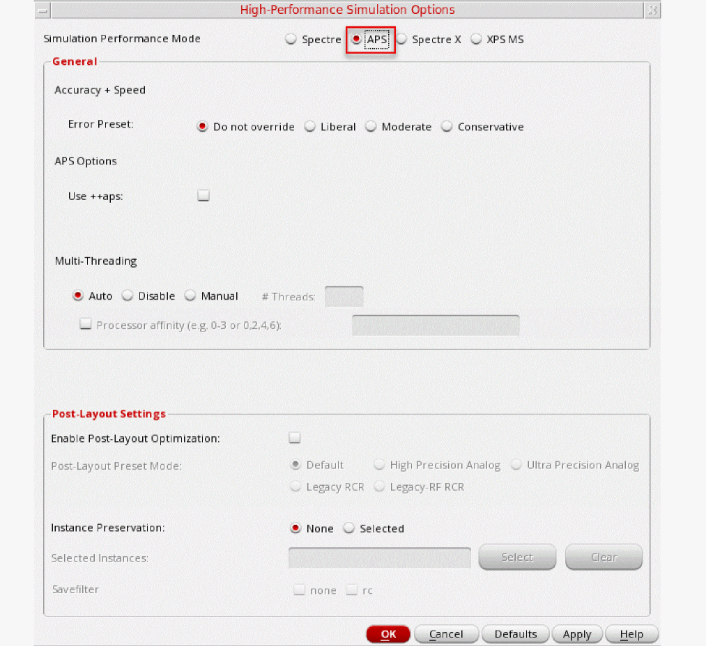 Figure 2-7 High Performance Simulation OptionsIn the High Performance Simulation Options window, select APS for Simulation Performance Mode. Note that Auto is selected for Multithreading options. The effect of this is to detect the number of cores on the system (up to 64) and then multi-thread on all the available cores.