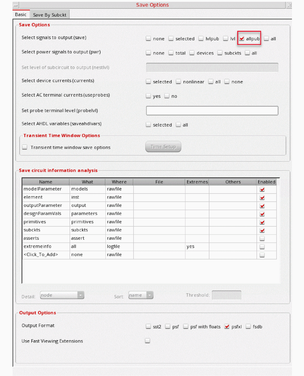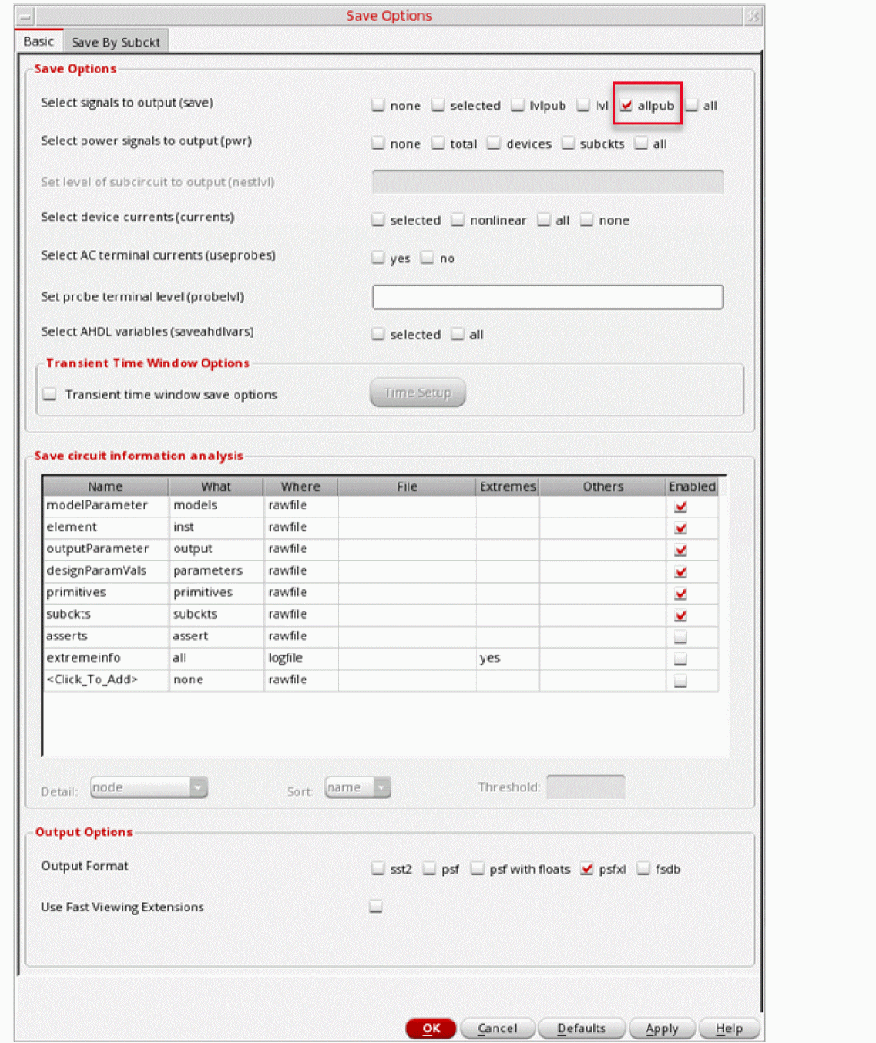 This is the default selection. This saves all of the node voltages at all levels of the hierarchy, but it does not include the node voltages inside the device models.