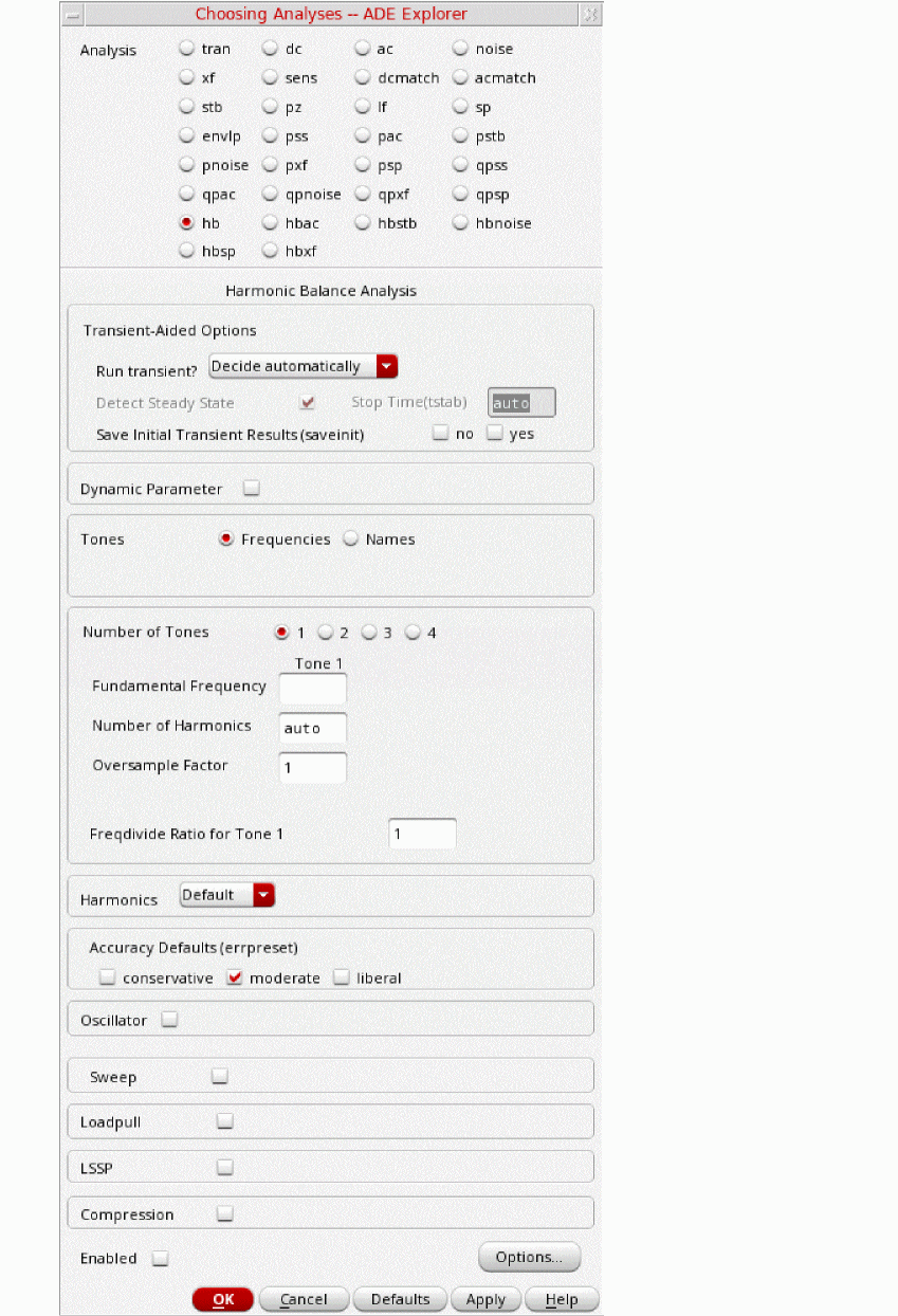 Figure 2-61 hb Choosing Analyses FormHarmonic balance can set the harmonics automatically for the signal that causes the most distortion. This is recommended in the general case. To enable this, select Decide automatically or Yes from the Run Transient? drop-down list in the Transient-Aided Options section. This single action will cause a transient analysis to be run until steady-state is detected, and then from the transient analysis, the number of harmonics for Tone1 (when Frequencies is selected) or for the tone that has tstab enabled (when Names is selected).