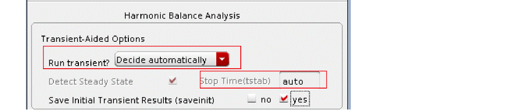 When Run transient? is set to Decide automatically, the Detect Steady State option is checked automatically. When this is set, the simulator stops the transient analysis when steady-state is detected in the tstab interval, runs the FFT, and starts iterating in the frequency domain. Using Decide automatically simplifies the setup for harmonic balance, and produces correct answers from hb without needing to know how to set hb up manually. -