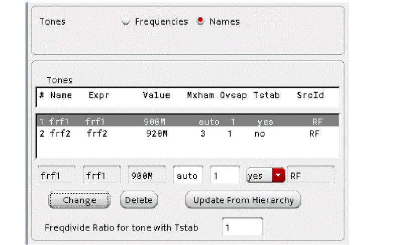 The frequency values for the frf1 andfrf2 tones are set in the Design Variables section of the ADE Explorer, which will be shown later. - Select the frf1 tone in the Tones field.
