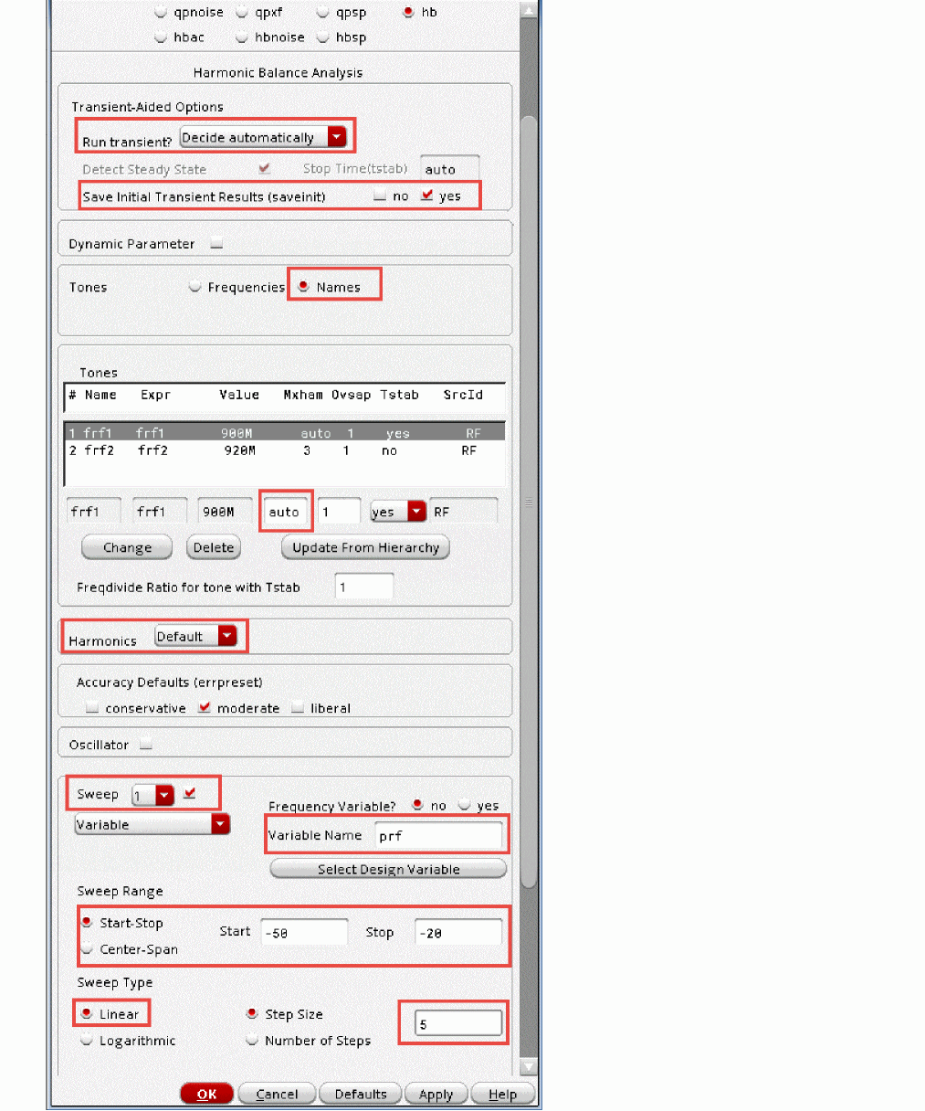 Because you are using auto-tstab, you do not need to set Tstab to yes in the Tones section for one of the large signal tones. The signal withtstab=yesis the signal that is used for transient-assisted harmonic balance. Only one signal can have transient assist, that being the signal with Tstab set toyes.If for some reason you are not using auto-tstab, set tstab to yes on the signal that causes the largest amount of distortion in the system.During the tstab interval, a transient analysis is run before the frequency domain iteration of harmonic balance. At the end of the tstab, an FFT is run and its result is used as the starting point for the frequency domain iterations. All the signals are applied and the simulation is performed in the frequency domain. - Leave the Harmonics field set to Default.