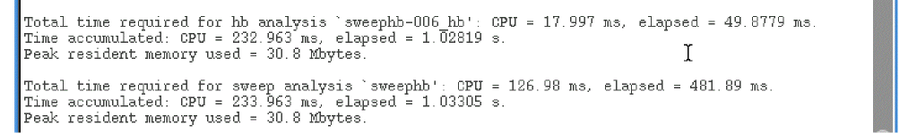 This netlists the design and runs the simulation. A SpectreRF status window appears (spectre.out logfile). Note the simulation time in the Spectre output logfile.