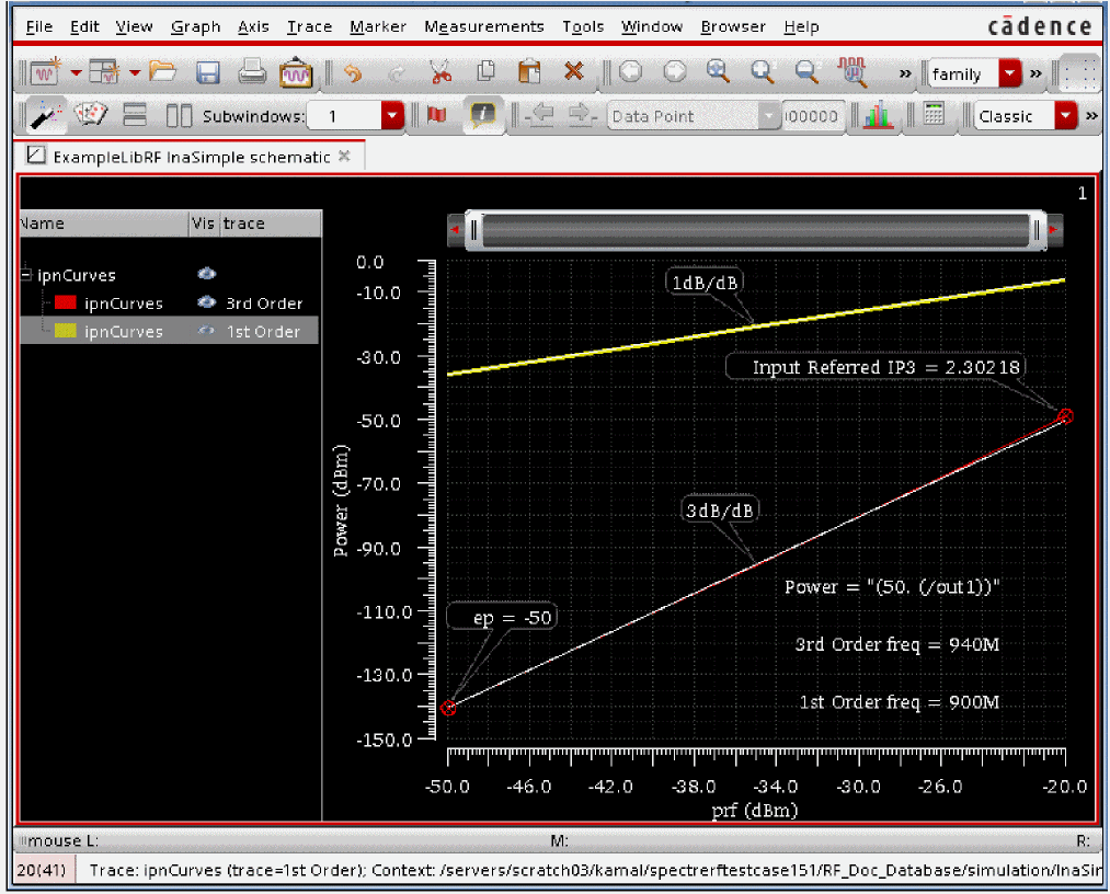 If you do not see the IP3 readout, click in the graphics area to deselect the marker, then select and move the Input Referred IP3 readout so that it is positioned in the visible area of the graph.Intermodulation products increase at rates that are multiples of the fundamentals. In the small-signal region, third order terms increase 3dB per dB.