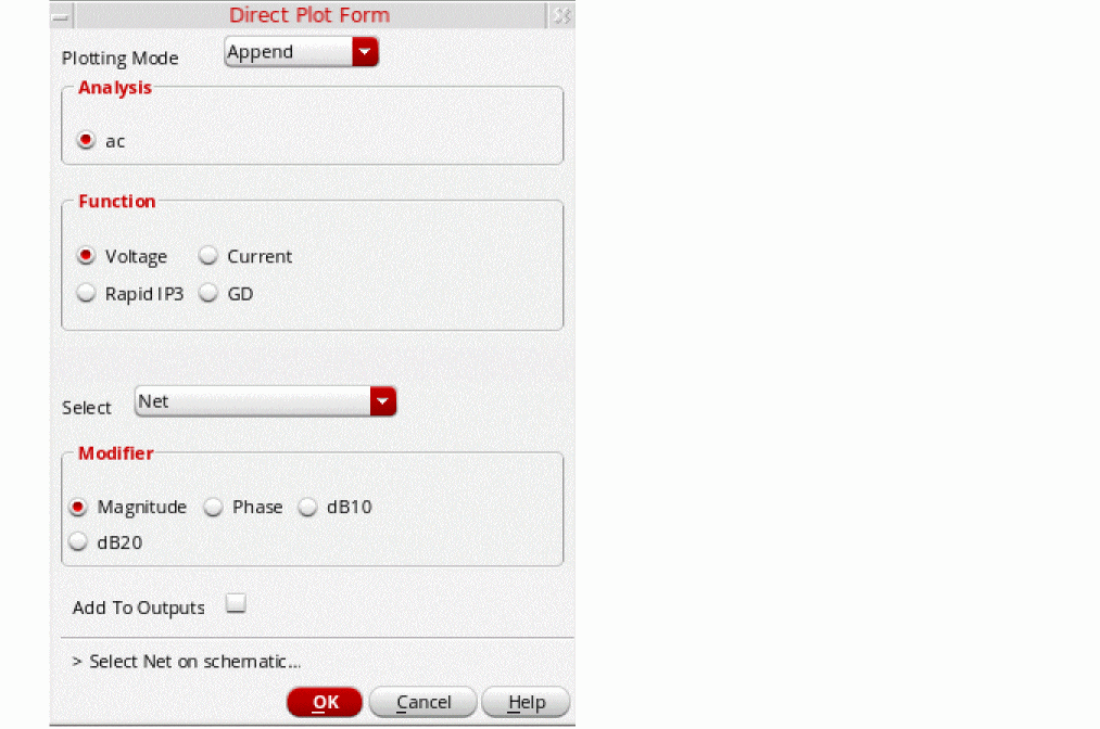 To save the currents, select nonlinear in the Select device currents (currents) section if you just want to save the device currents, or select all if you want to save all the currents in the circuit. - Click OK to close the Save Options form.