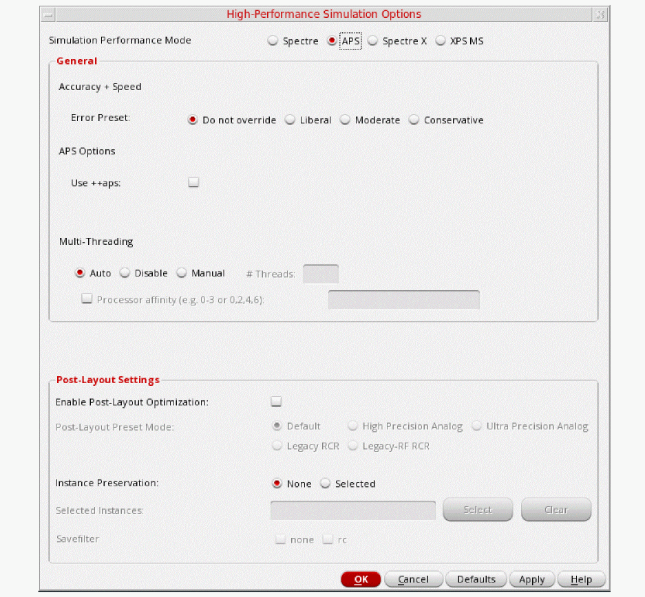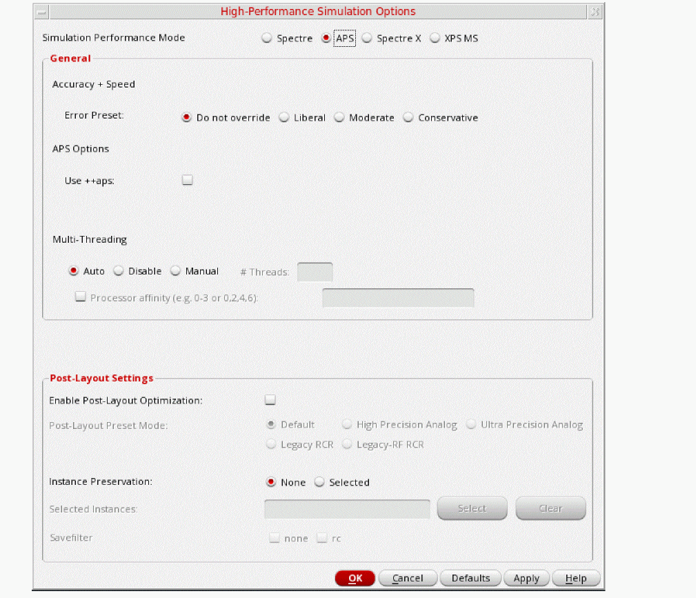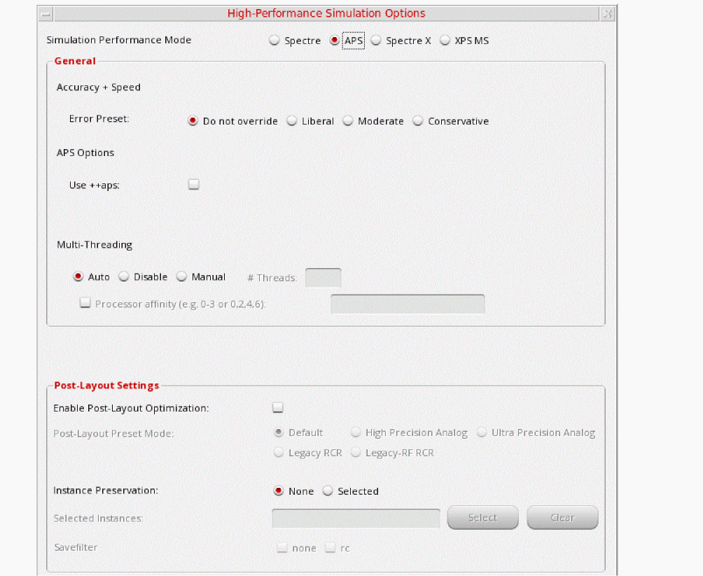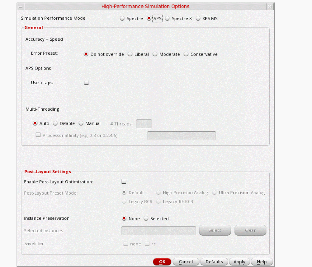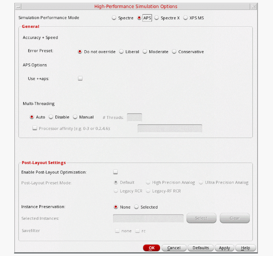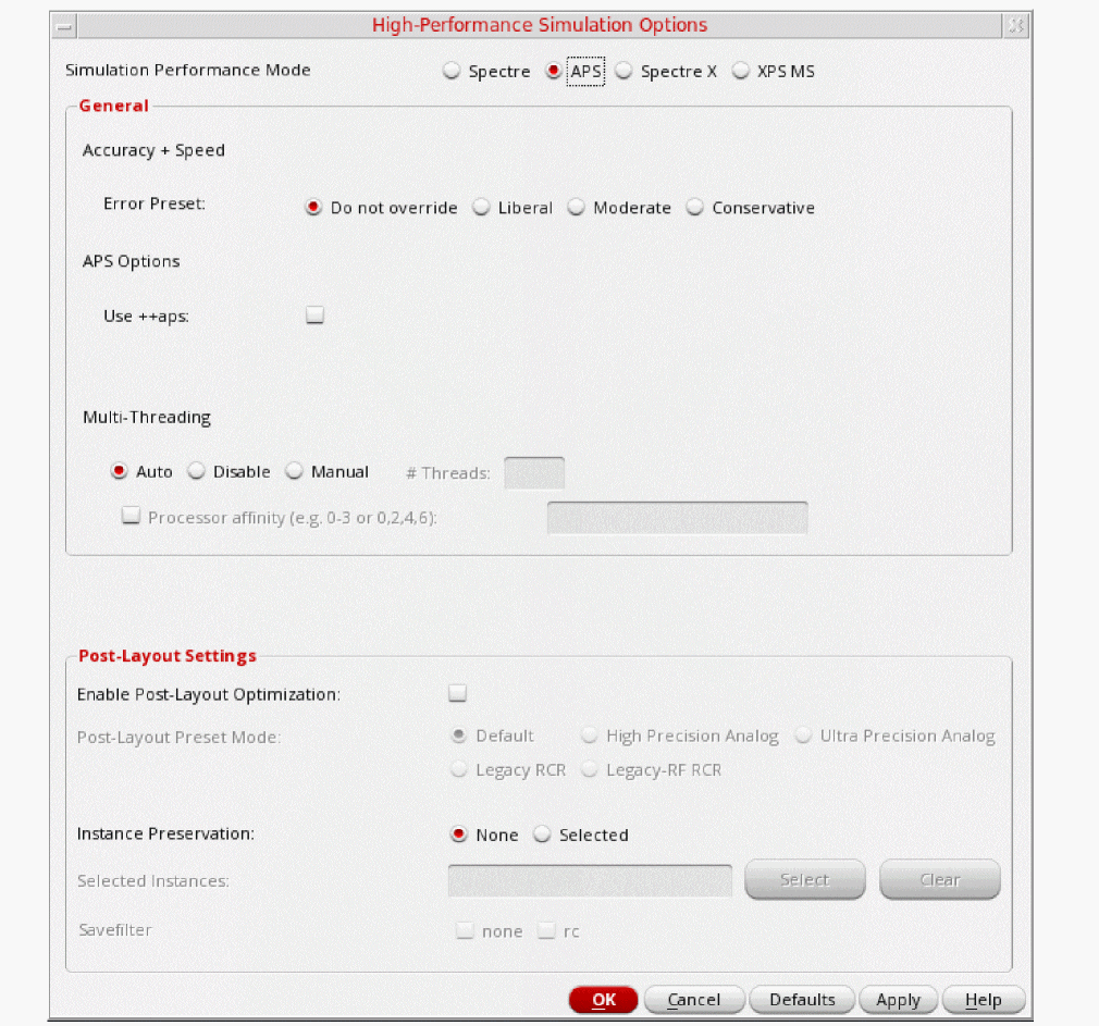 In the High Performance Simulation Options window, select APS. Note that Auto is selected for Multithreading options. The effect of this is to detect the number of cores on the system (up to 16) and then multi-thread on all the available cores. Usually, it is better to specify the number of threads yourself. Small circuits should use a small number of threads, and larger circuits can use more threads. The overhead of managing 16 threads on a smaller circuit may actually slow the simulation down, compared to two or four threads. Use the number of threads that maximizes the performance.
