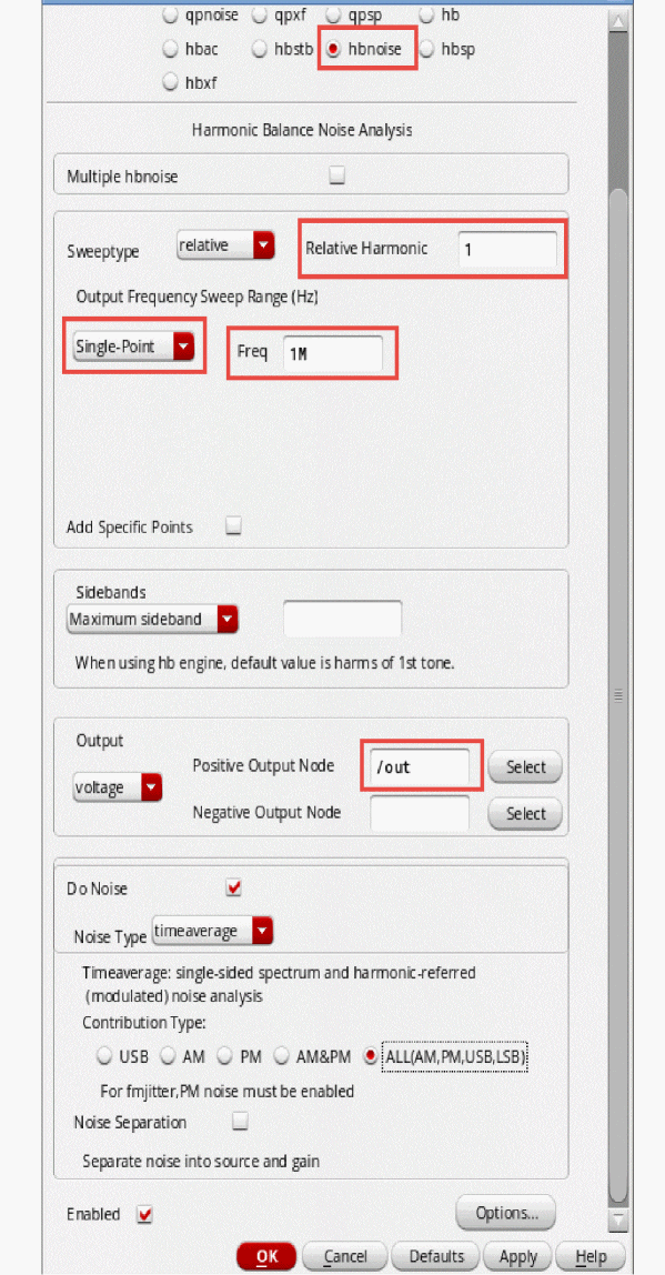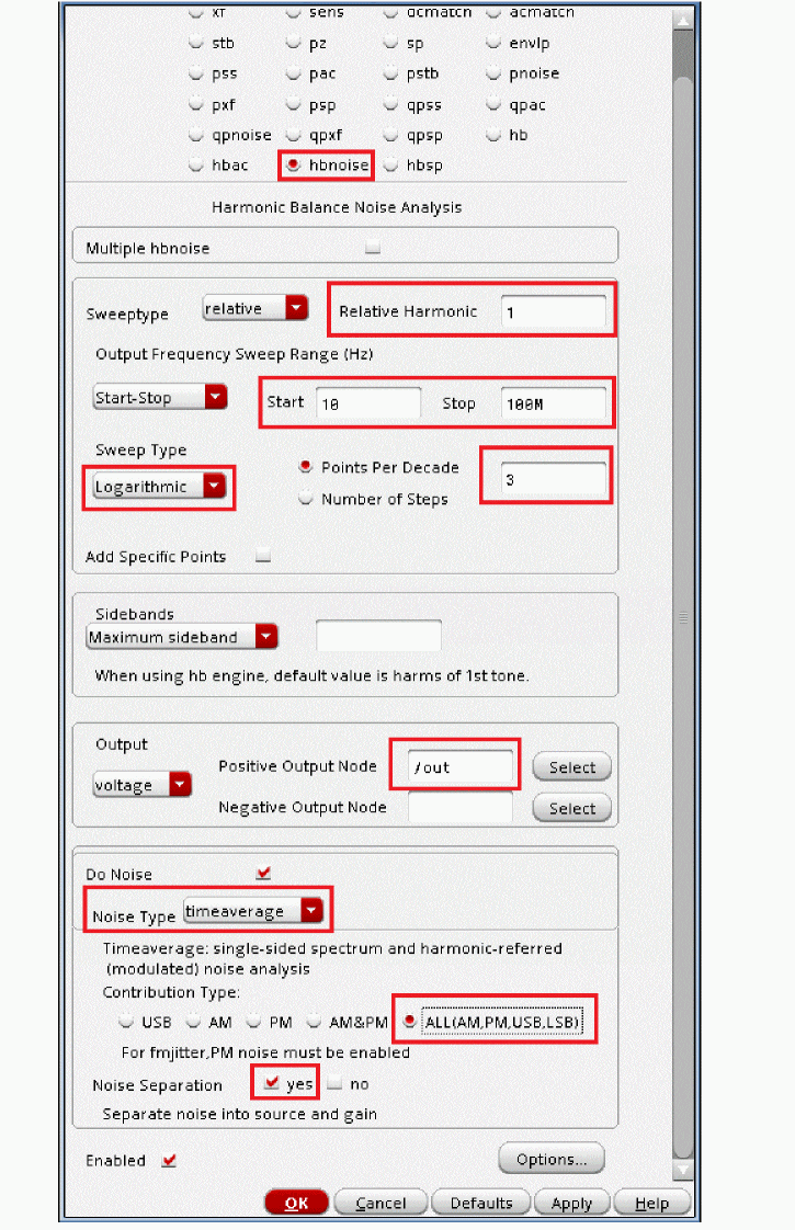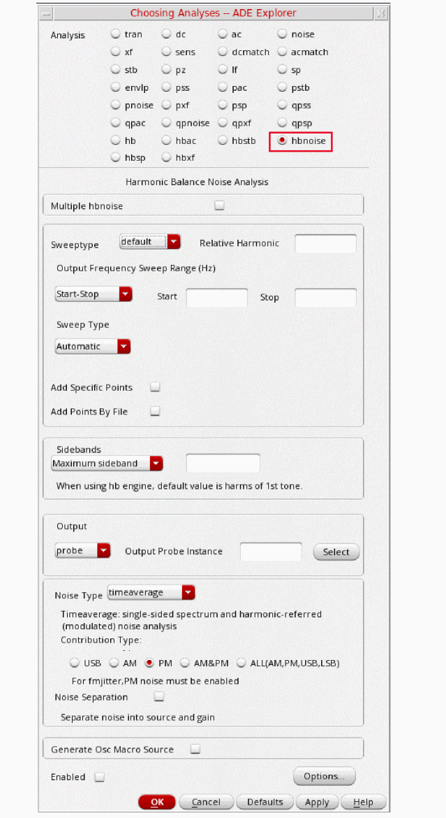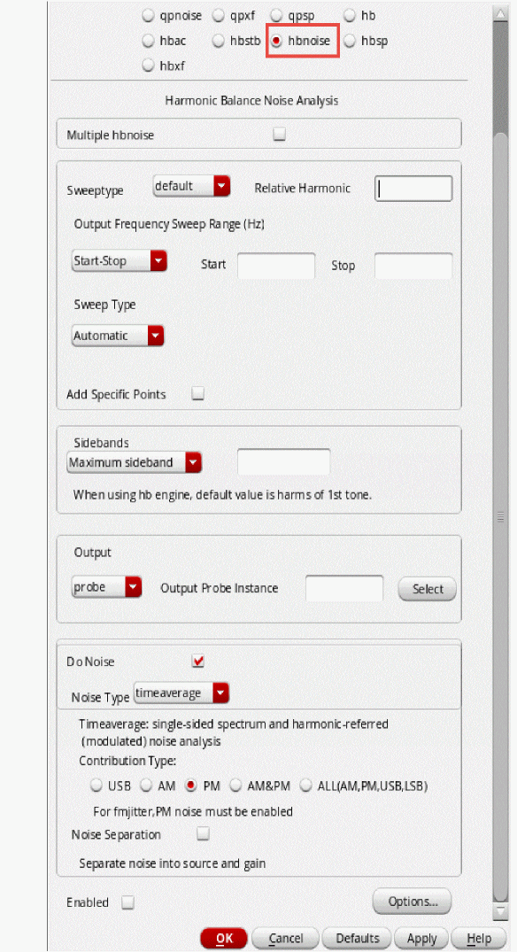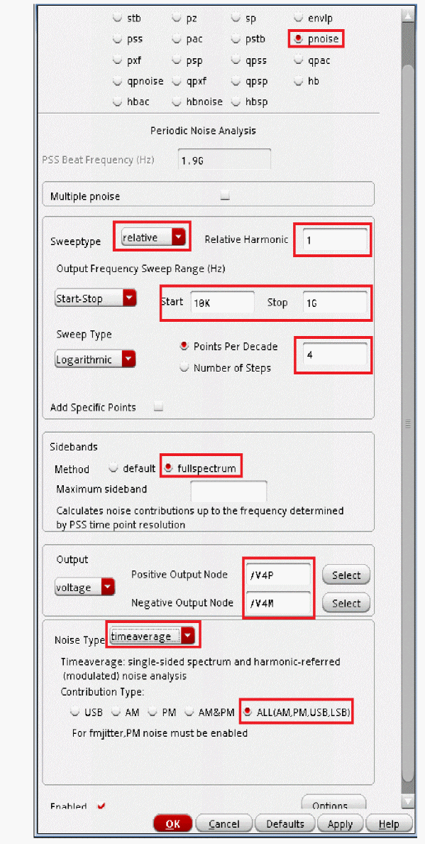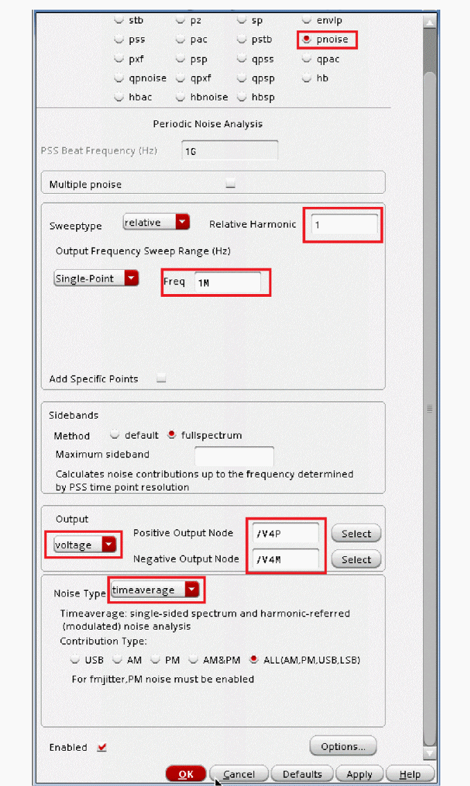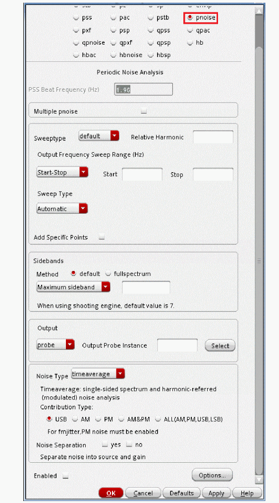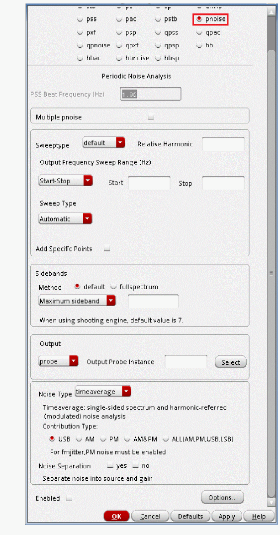 Fullspectrum pnoise is available for all available noisetypes. Noise separation is not supported when fullspectrum is selected.When the default method is selected, specify the number of desired frequency translations in the Maximum sideband field. This will always be specific to the design. For a rough estimate, plot the frequency domain content, and find the harmonic number where the amplitude has dropped about 40dB. Try this number in maximum sidebands. To verify that you have enough sidebands, raise the number by about 50% and run again. If the noise result did not change, then you had enough sidebands to begin with. Up to 40 sidebands can be specified by default. If you need more than 40 sidebands, set the number of pss harmonics to the number of sidebands divided by two to four or set the pss option maxacfreq to the beat frequency times the number of pnoise sidebands. - Leave Maximum sideband field blank as explained above since the Method selected is fullspectrum.