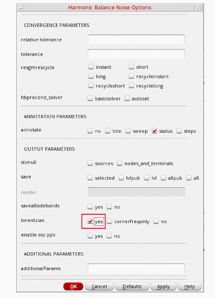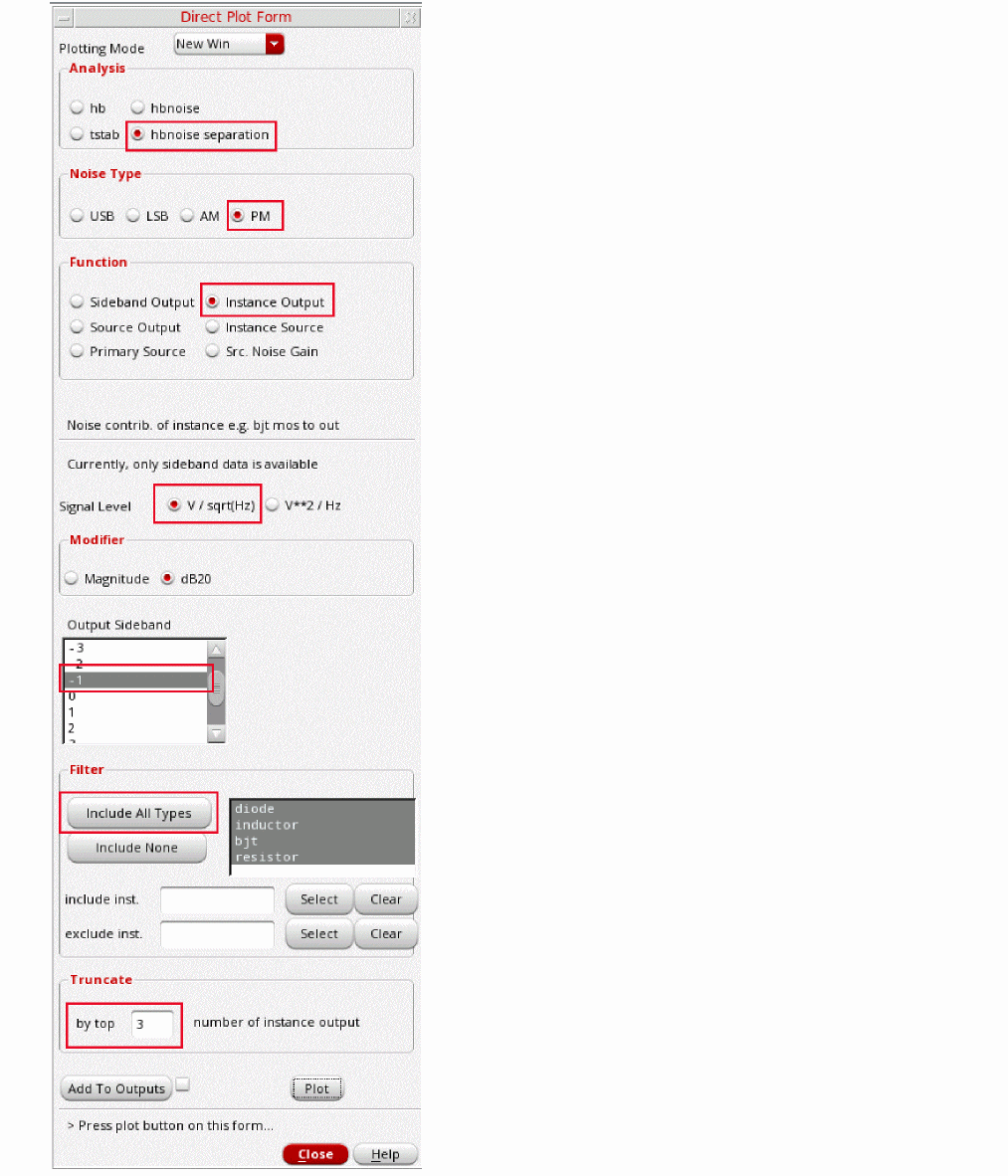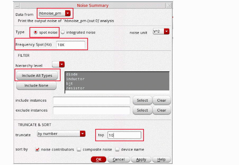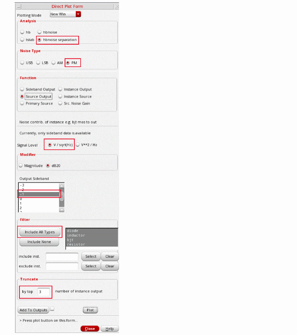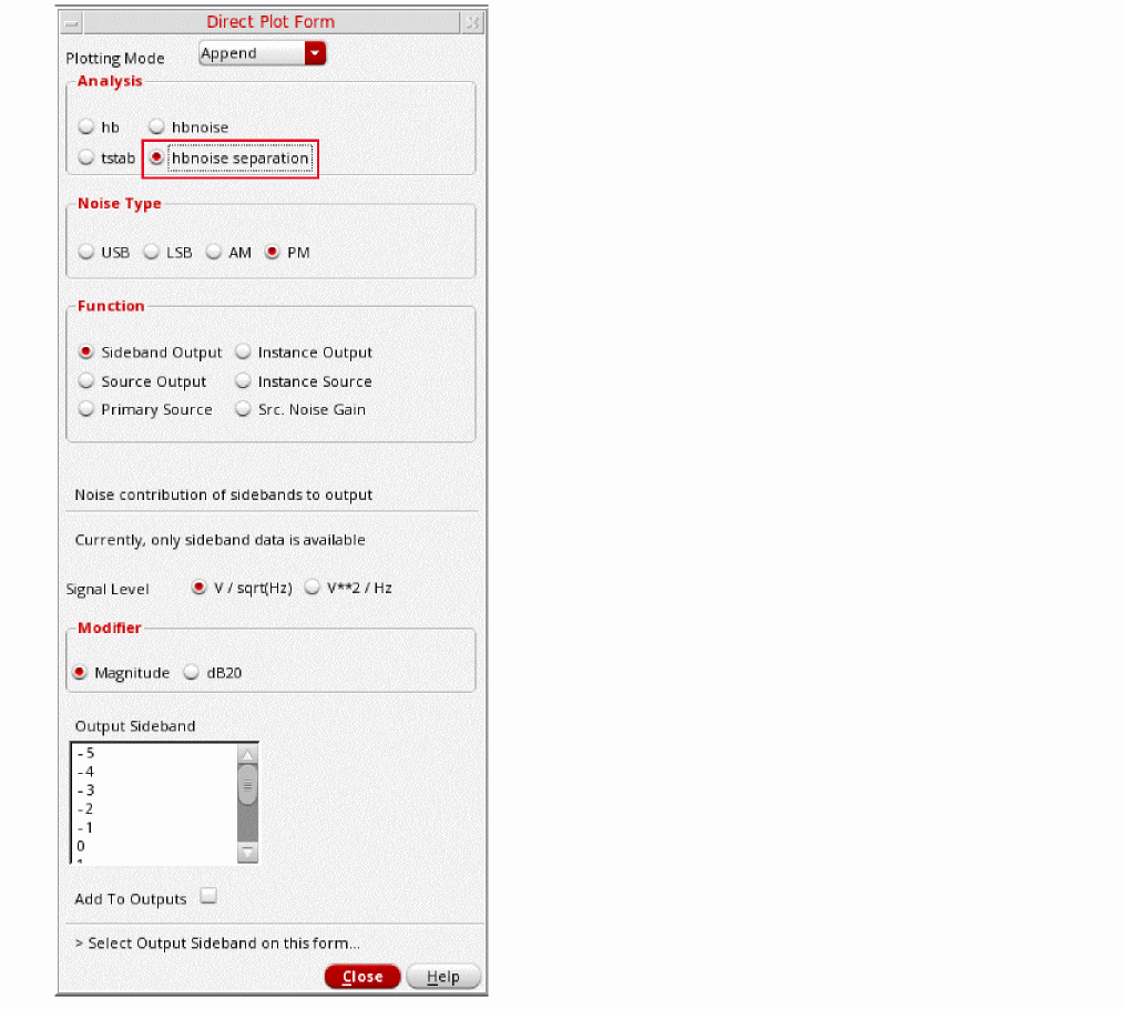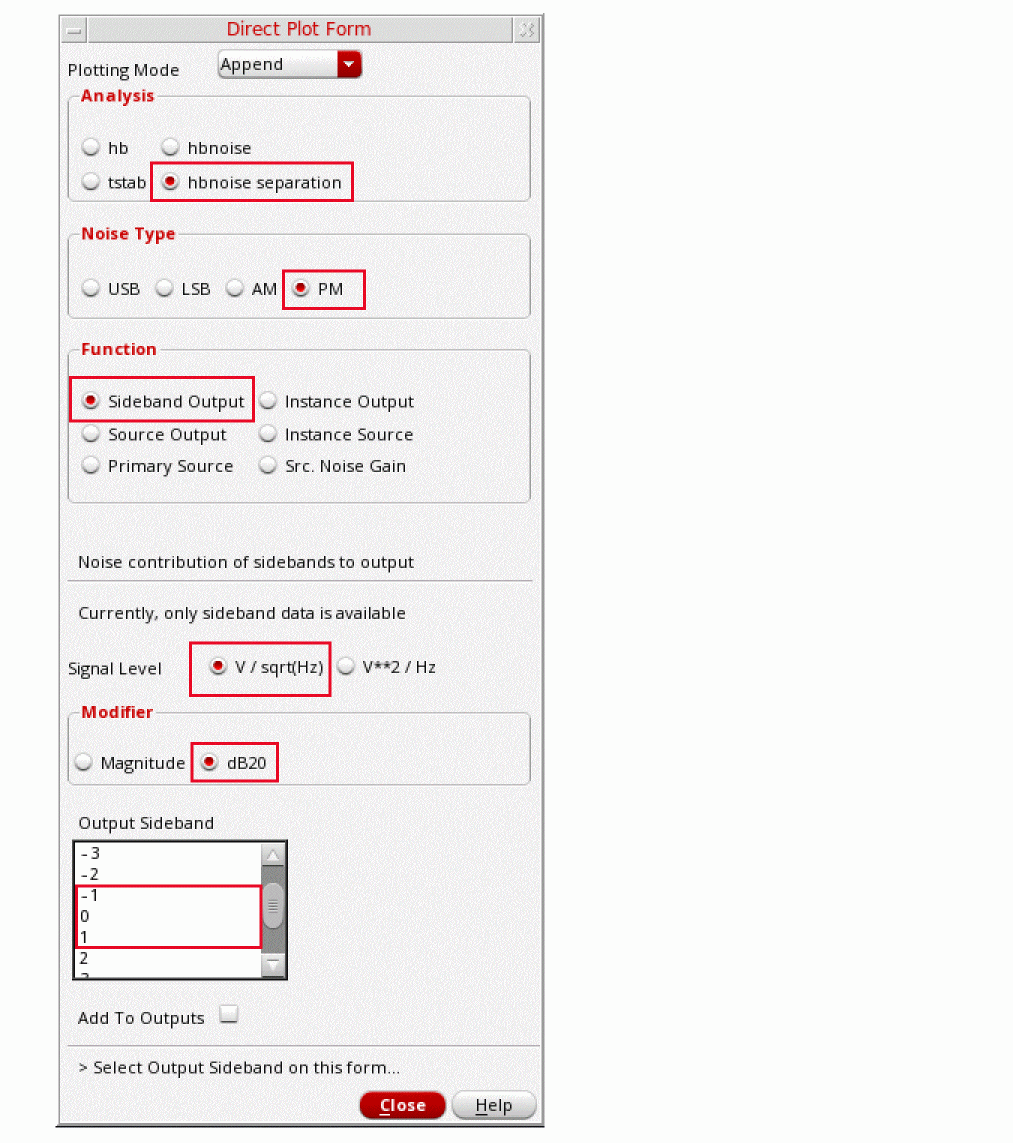 Fullspectrum pnoise is available for all available noisetypes. Noise separation is not supported when fullspectrum is selected.When the default method is selected, specify the number of desired frequency translations in the Maximum sideband field. This will always be specific to the design. For a rough estimate, plot the frequency domain content, and find the harmonic number where the amplitude has dropped about 40dB. Try this number in maximum sidebands. To verify that you have enough sidebands, raise the number by about 50% and run again. If the noise result did not change, then you had enough sidebands to begin with. Up to 40 sidebands can be specified by default. If you need more than 40 sidebands, set the number of pss harmonics to the number of sidebands divided by two to four or set the pss option maxacfreq to the beat frequency times the number of pnoise sidebands. - Leave Maximum sideband field blank as explained above since the Method selected is fullspectrum.