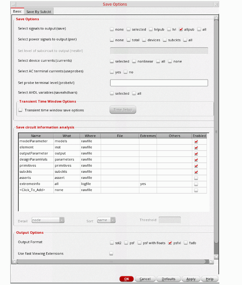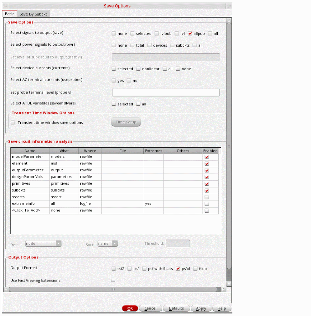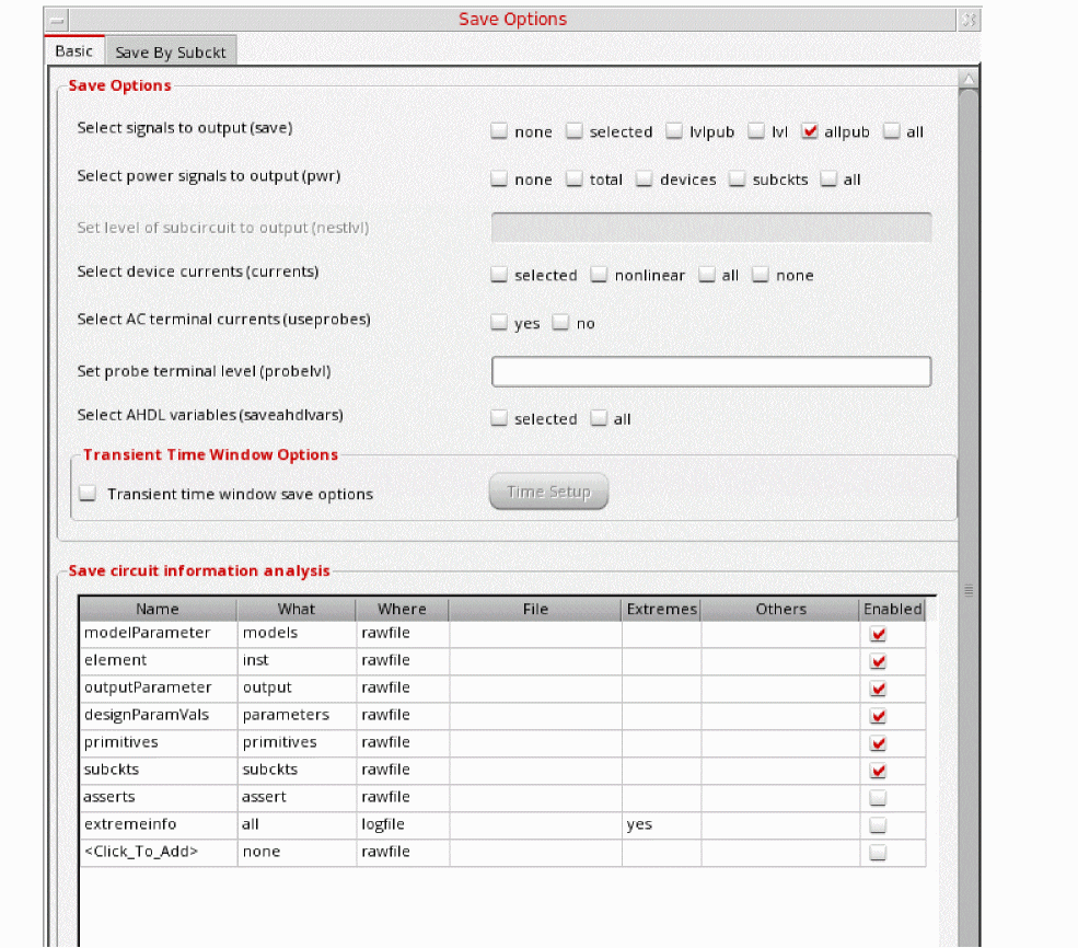 Figure 3-198 Save Options FormThis is the default selection. This saves all of the node voltages at all levels of the hierarchy, but it does not include the node voltages inside the device models.