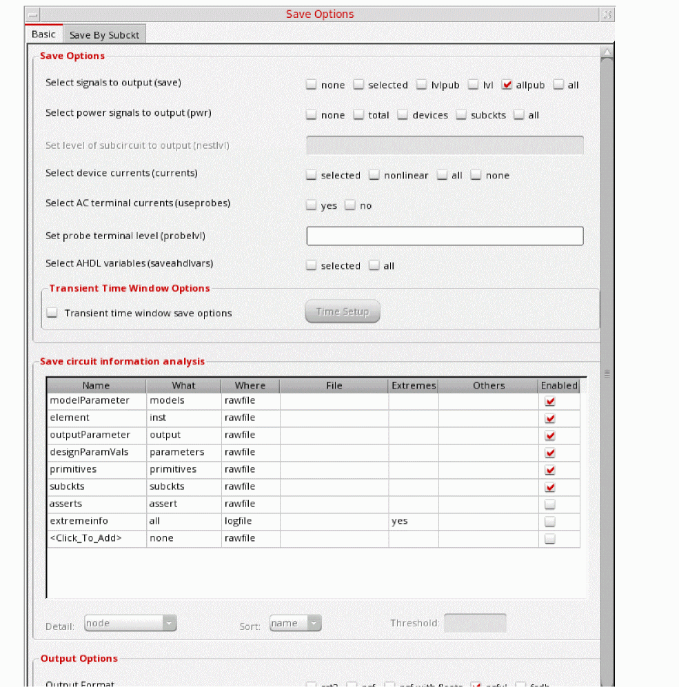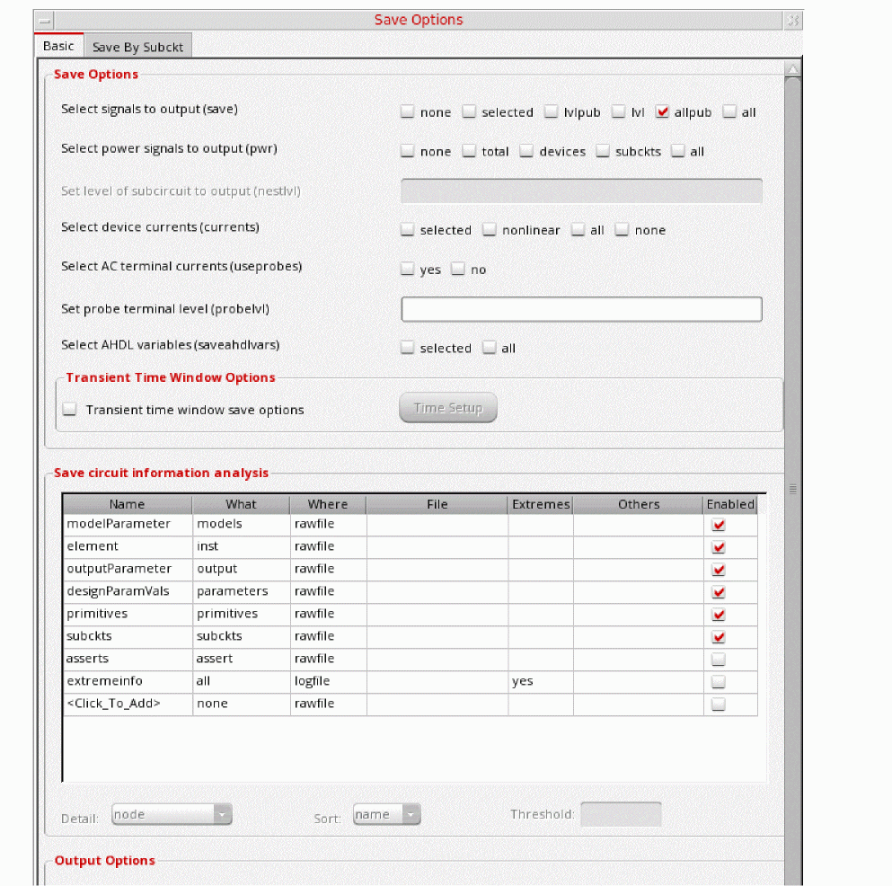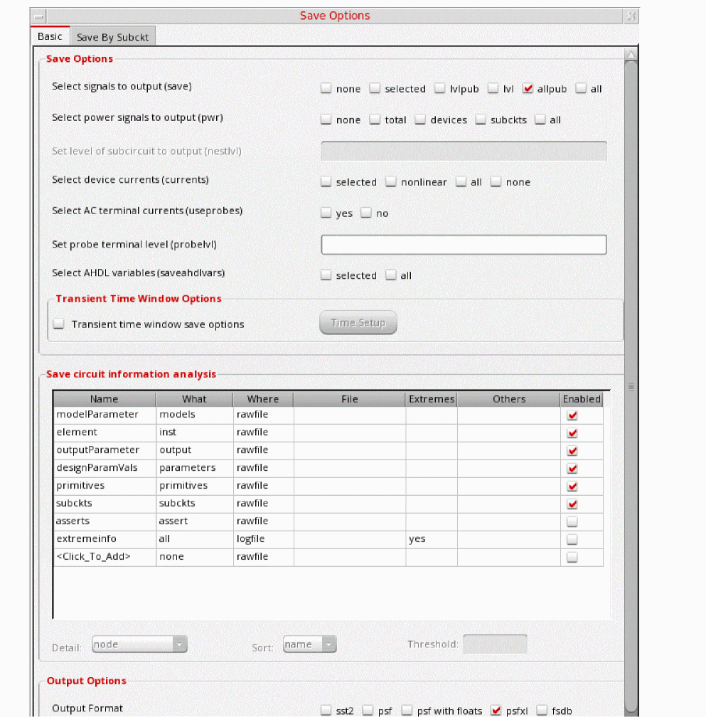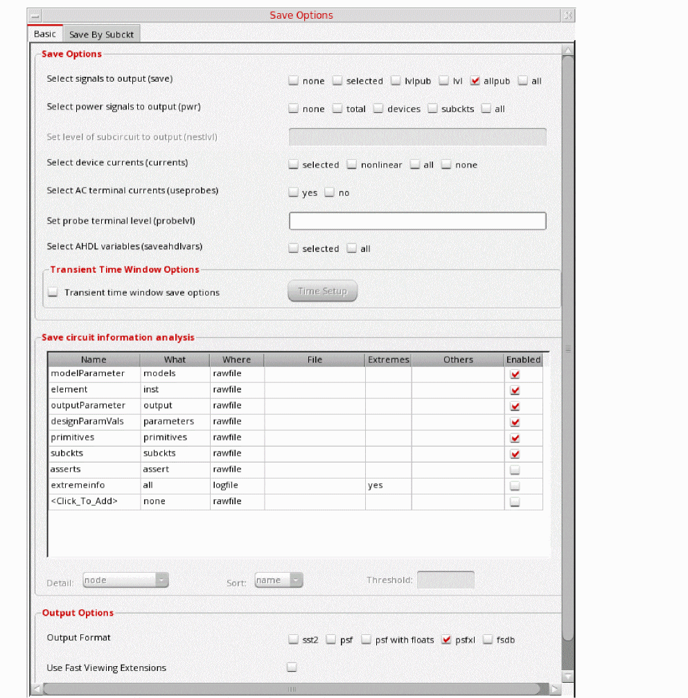 Figure 3-198 Save Options FormThis is the default selection. This saves all of the node voltages at all levels of the hierarchy, but it does not include the node voltages inside the device models.
