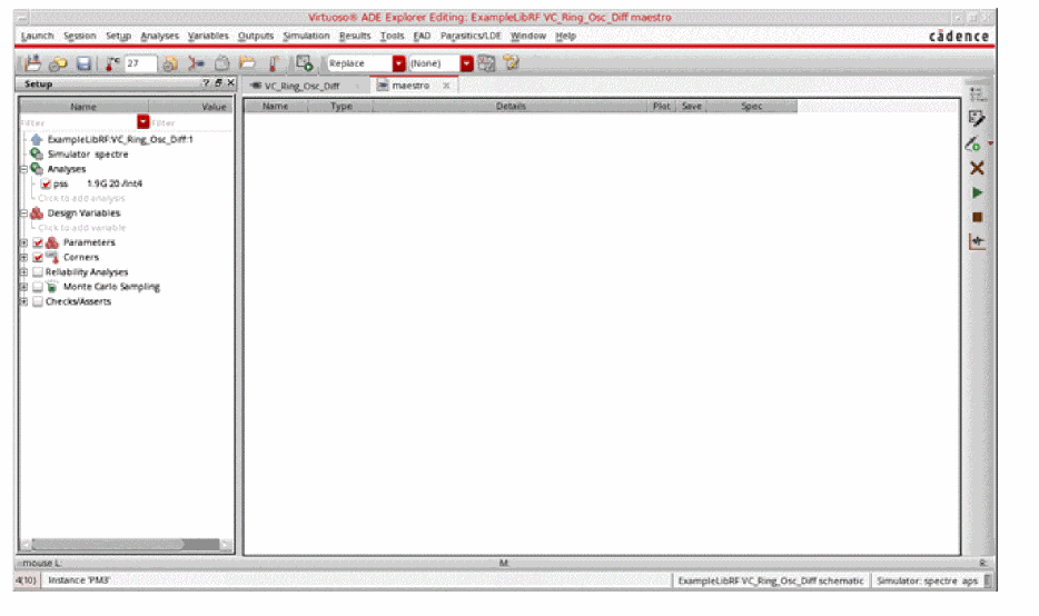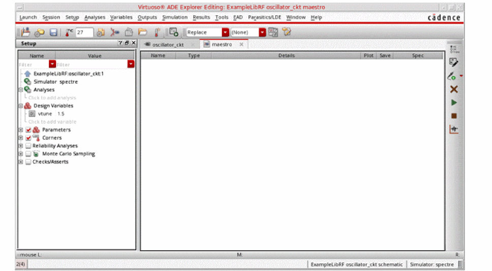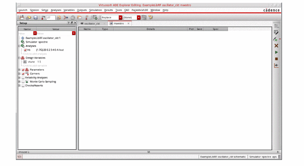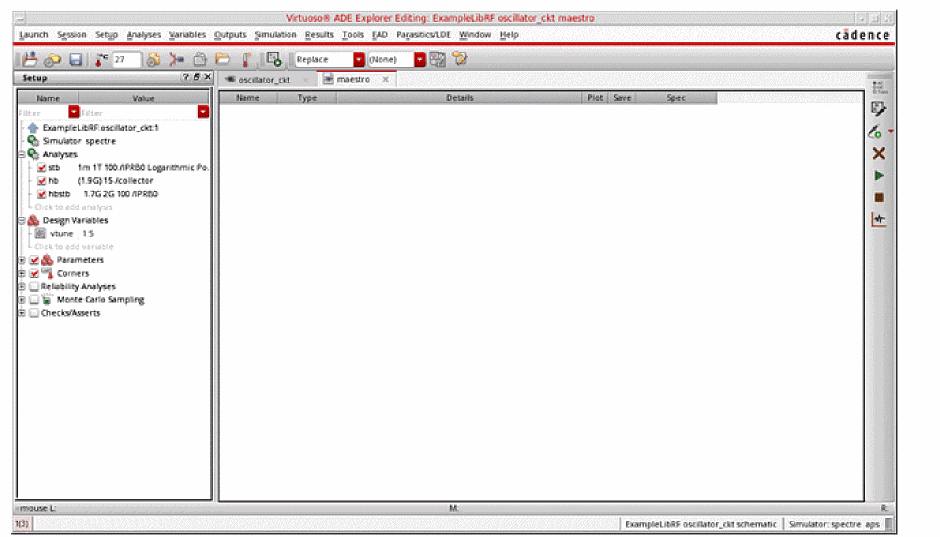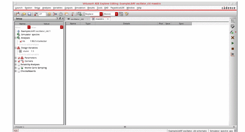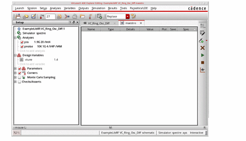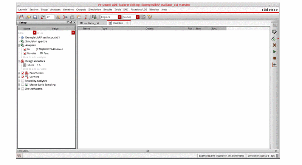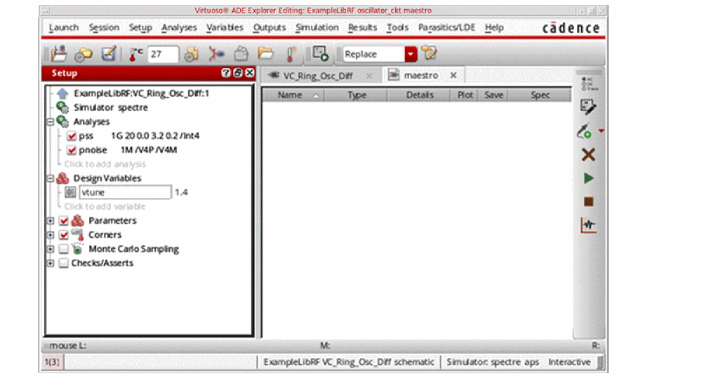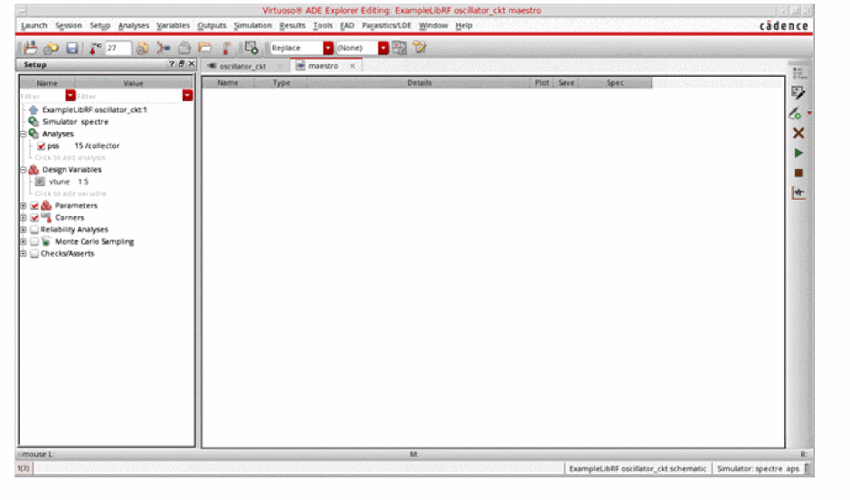 See Oscillators and Autonomous PSS Analysis in the Spectre Circuit Simulator RF Analysis Theory for more information on oscillator simulation. In addition to this you may also refer to Spectre Circuit Simulator and Accelerated Parallel Simulator RF Analysis User Guide.