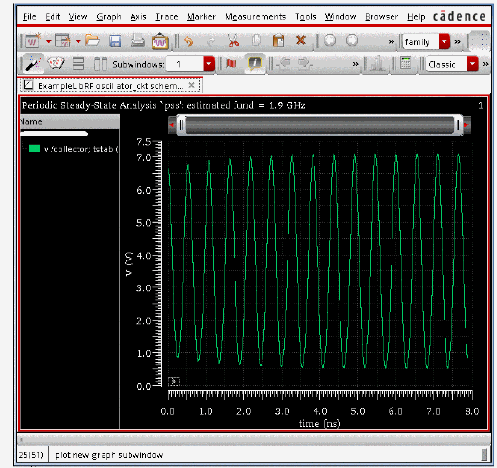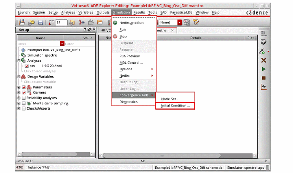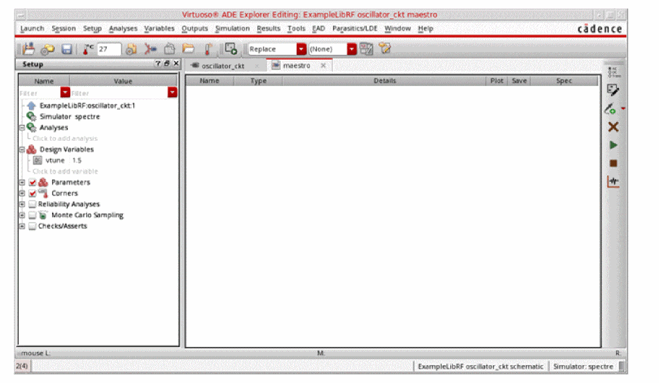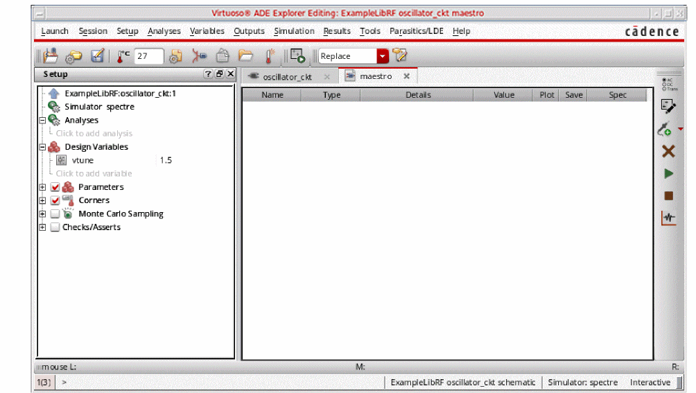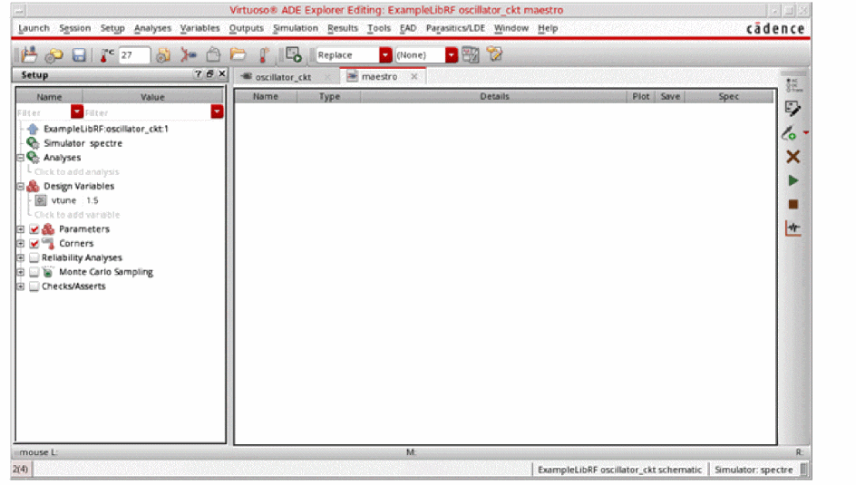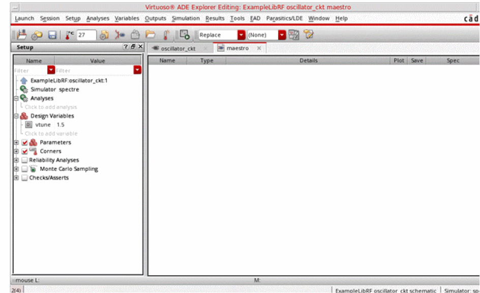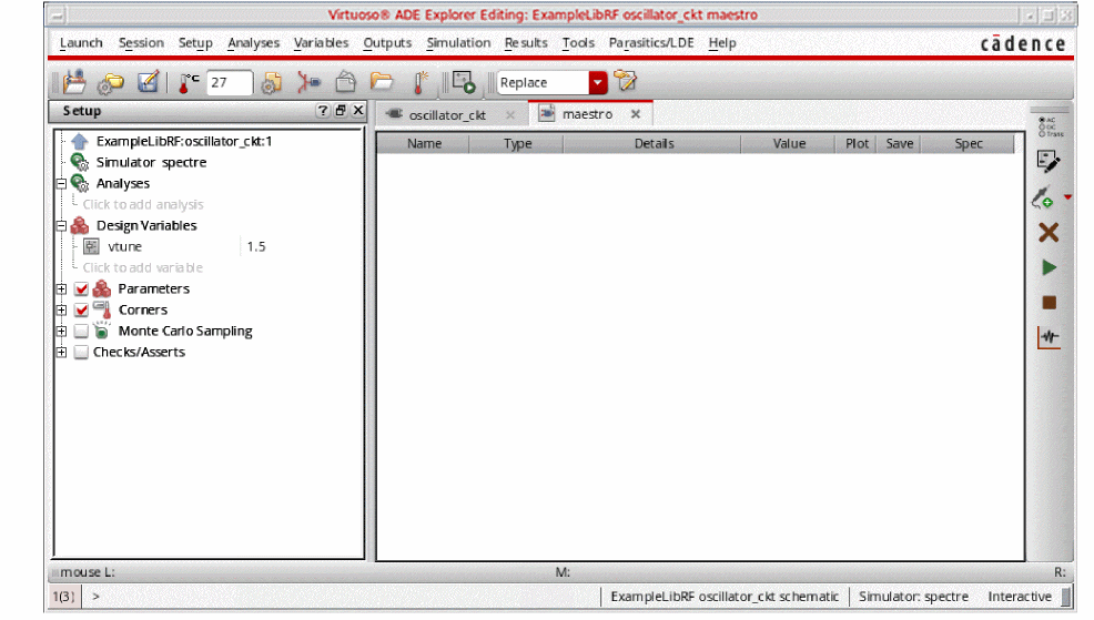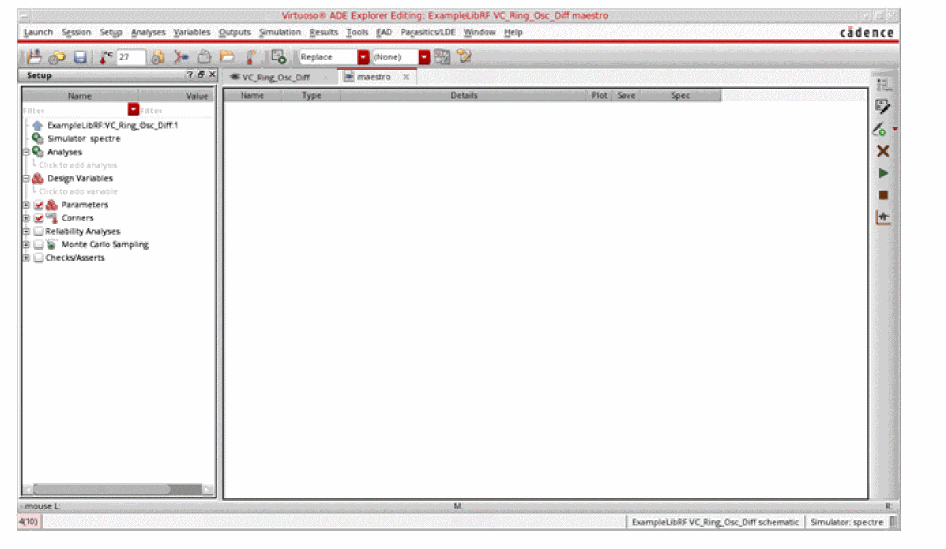 See Oscillators and Autonomous PSS Analysis in the Spectre Circuit Simulator RF Analysis Theory for more information on oscillator simulation. In addition to this you may also refer to Spectre Circuit Simulator and Accelerated Parallel Simulator RF Analysis User Guide.