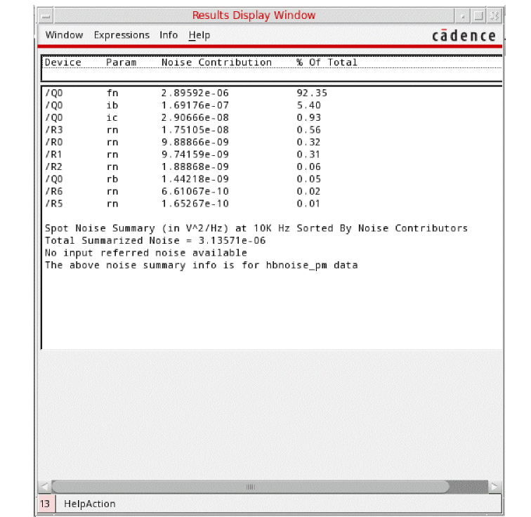 For oscillators, the hbnoise/pnoise frequency range defaults to relative. Specify the harmonic number as appropriate for the system you are simulating. If you are simulating an oscillator by itself, then the harmonic number is likely to be 1. If you have an oscillator and a diode frequency doubler, then the harmonic number is likely to be 2. If you have an oscillator with a frequency divider, in the hb/pss form, you should specify the approximate frequency of oscillation for the frequency-divided signal. In the hbnoise/pnoise form, if the noise is desired on the frequency divided output, then the relative harmonic is 1. If the noise is desired at the output of the oscillator, the relative harmonic number is the divide ratio. The meaning of relative is to take the frequency of the harmonic number specified and add to it the frequencies specified in the Choosing Analyses form. If the oscillator had a 1GHz output, and the pnoise had 1M relative to the first harmonic specified, the actual output frequency is 1G + 1M, or 1001M. -