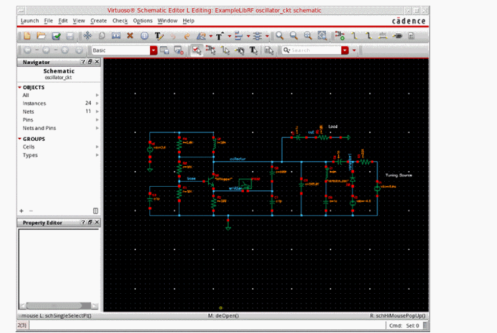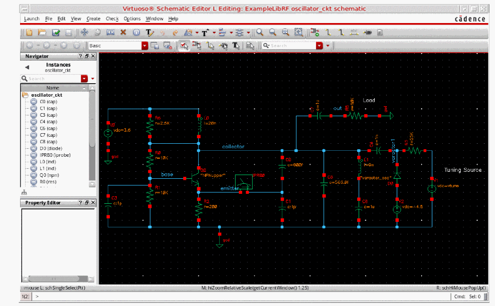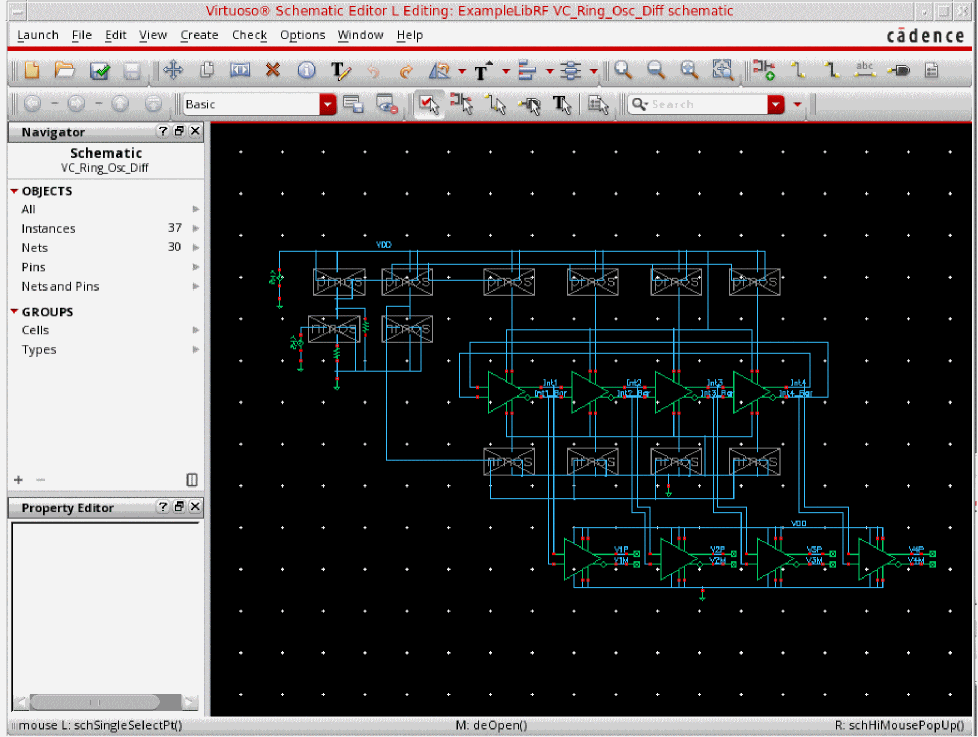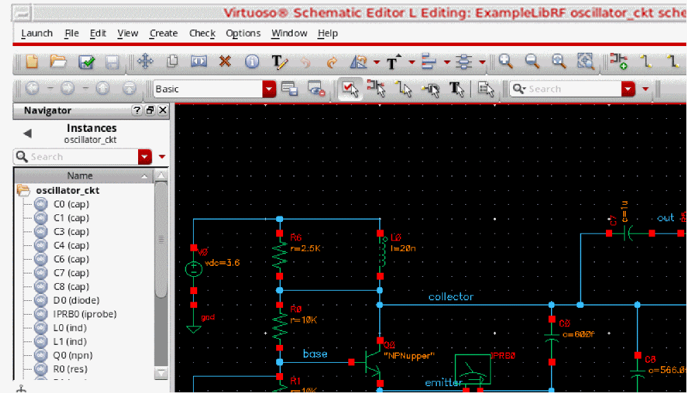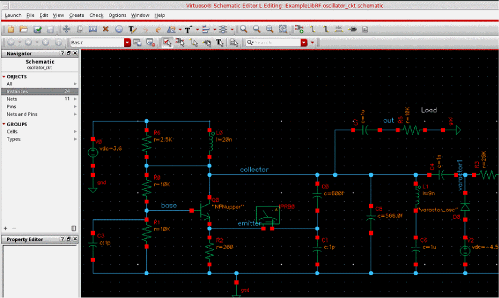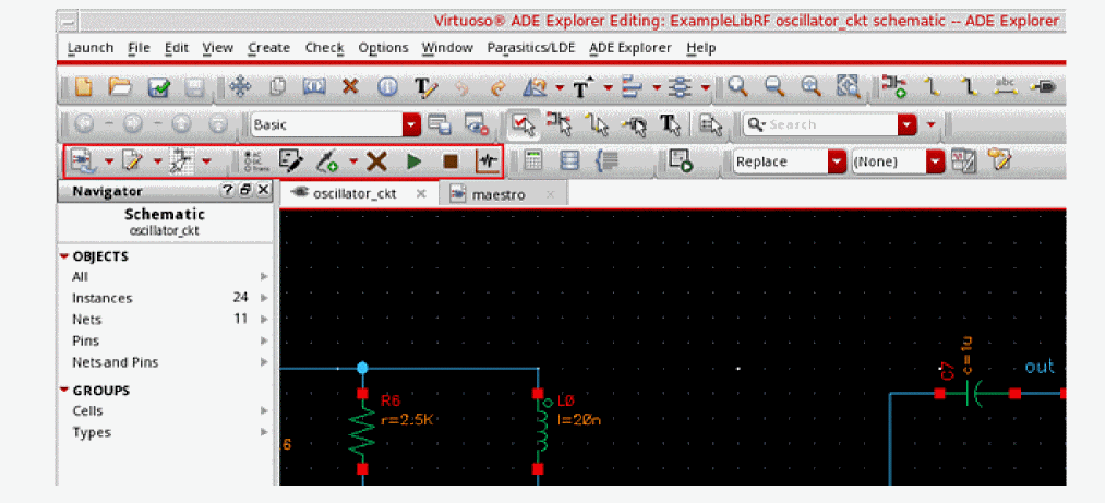 This will open oscillator_ckt schematic in Virtuoso Schematic Editor L window, as shown below.