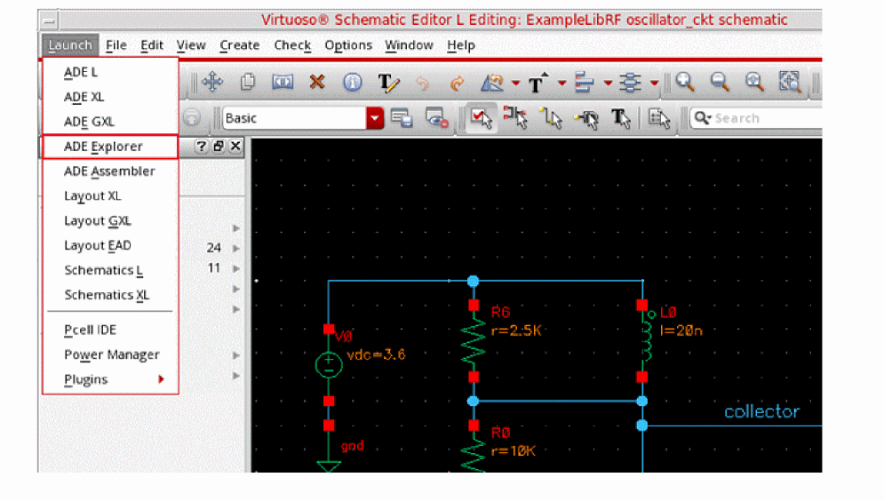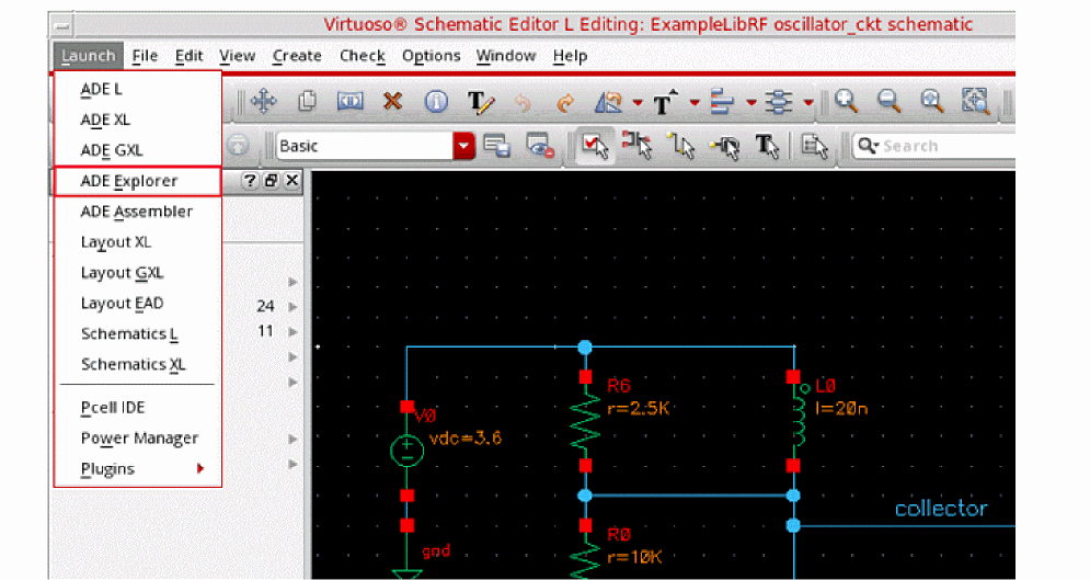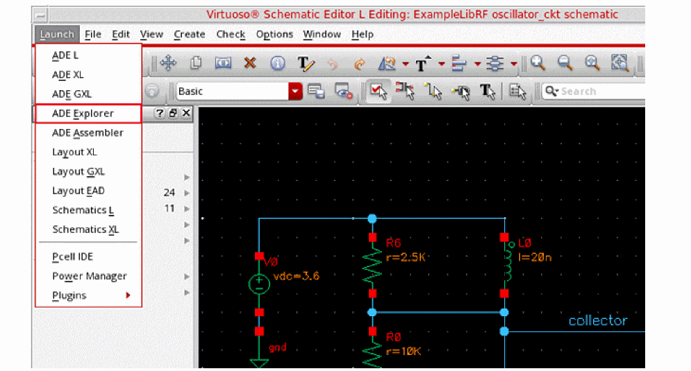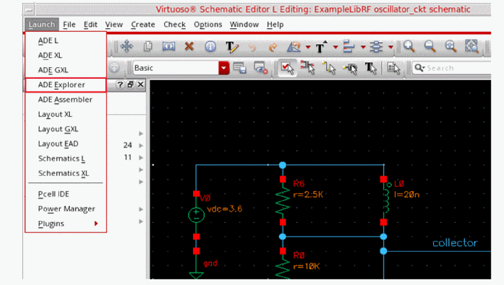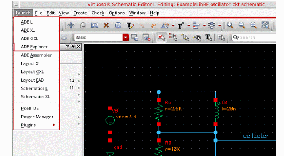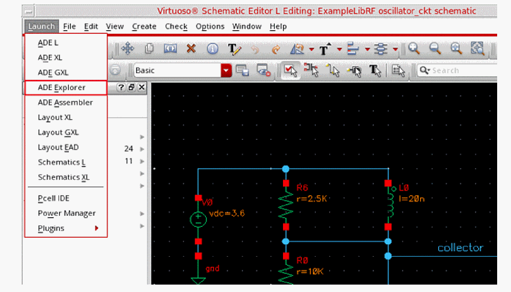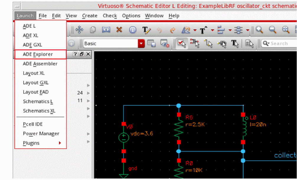 In the Schematic Window, choose Launch - ADE Explorer.