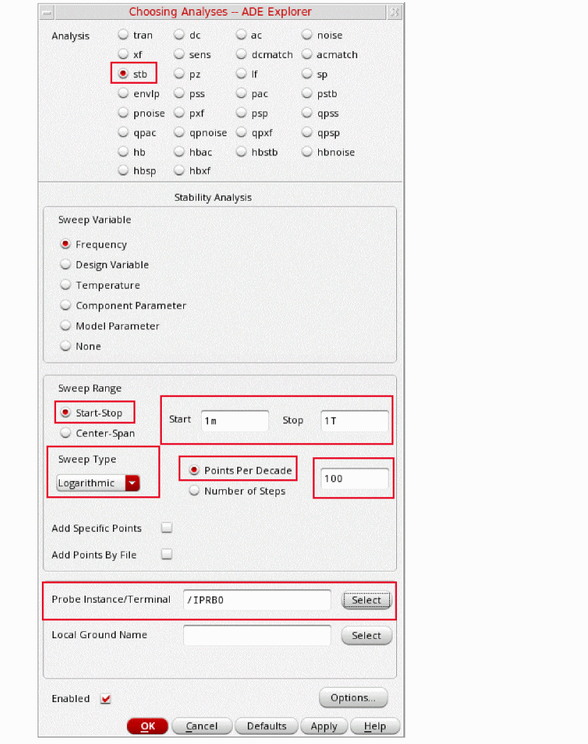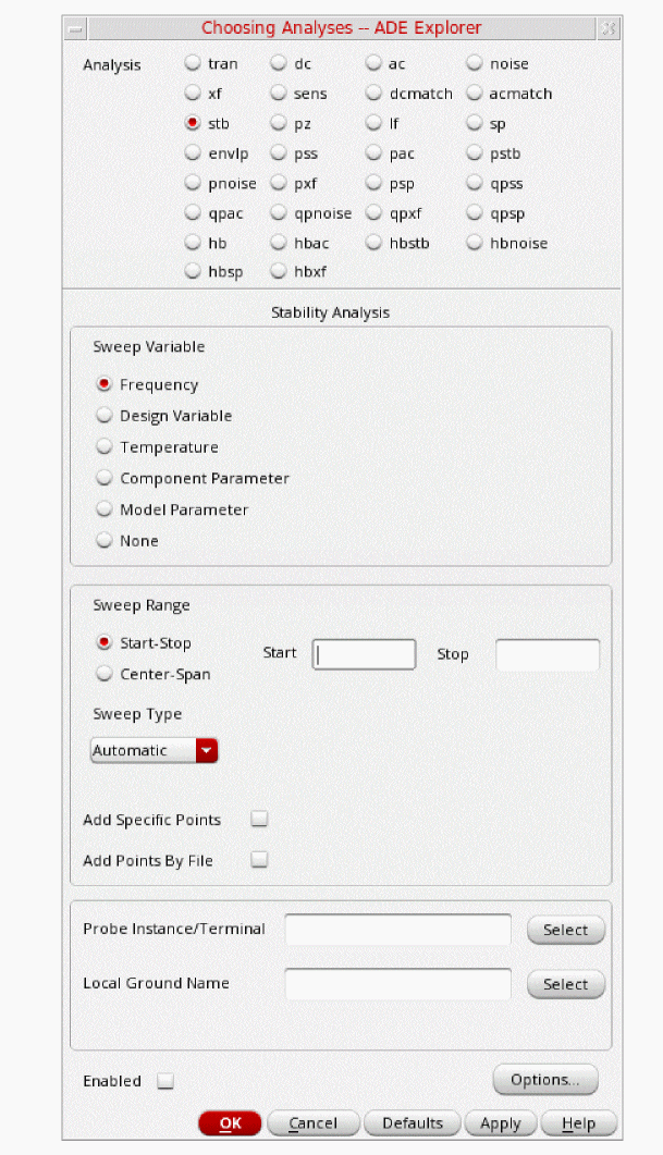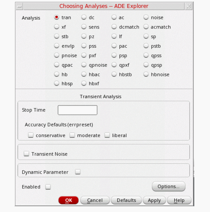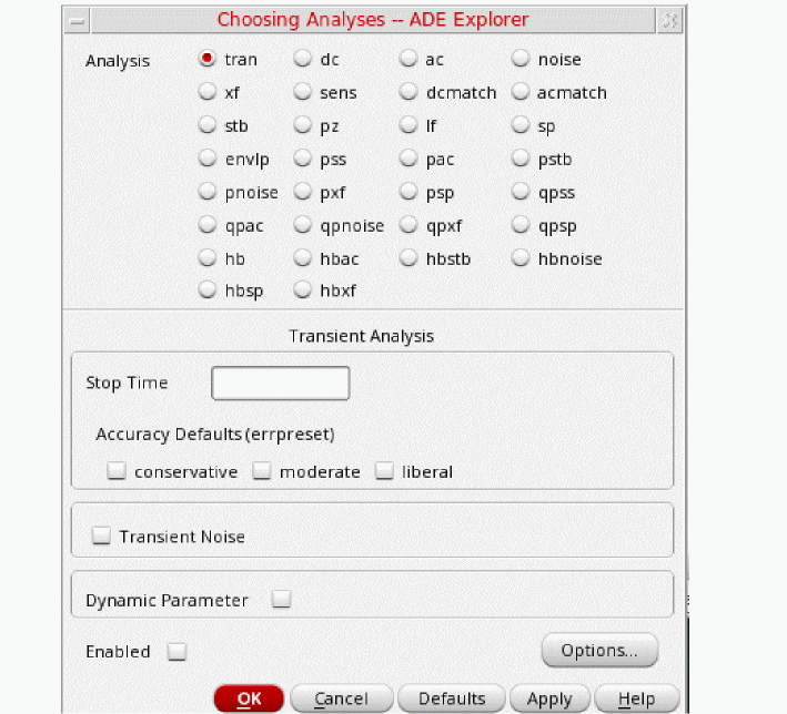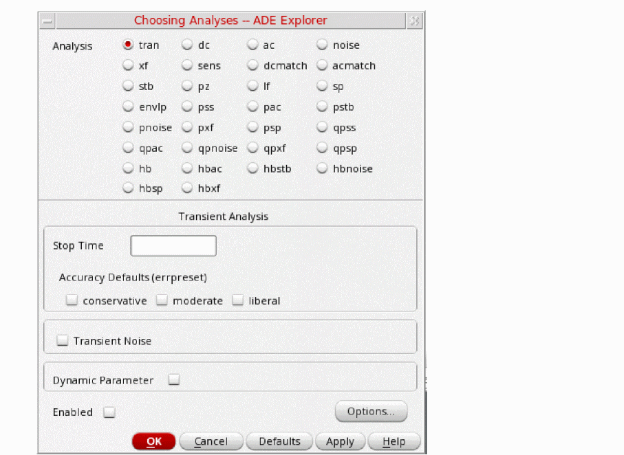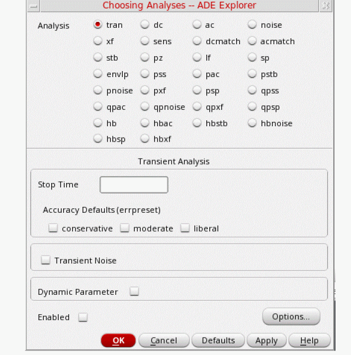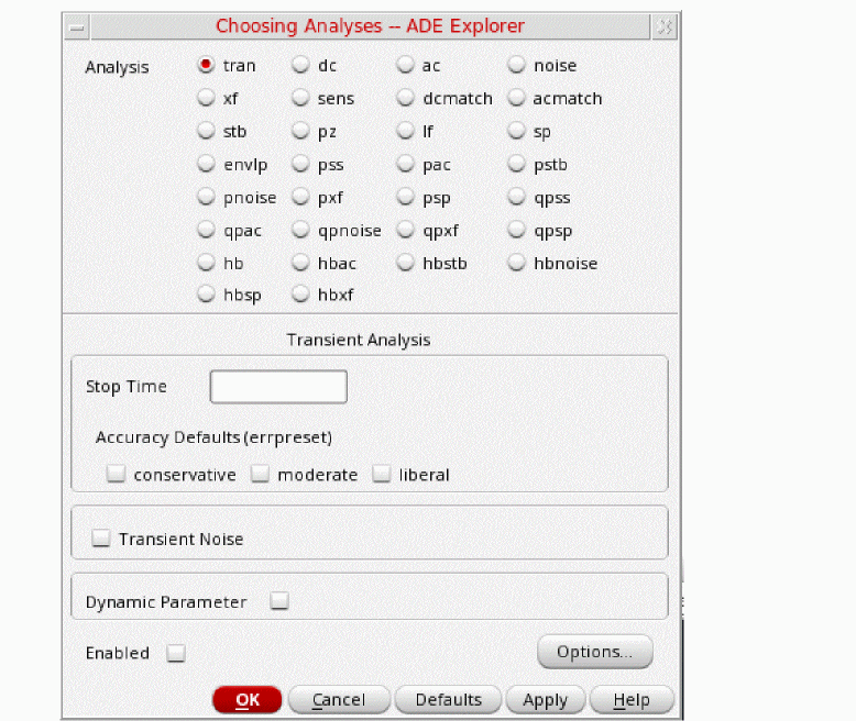 tstab is typically set to about 2-3 periods of the oscillation frequency for ring oscillator circuits. Note that this needs to apply for the lowest frequency that is produced. For that reason, 10n is set. - Select yes for Save Initial Transient Results. This will help in visualizing the buildup of the oscillation waveform.