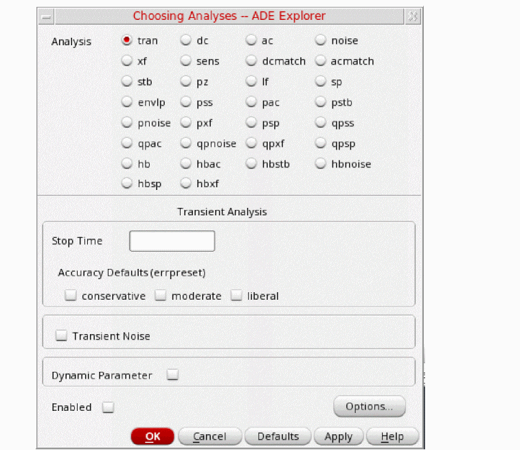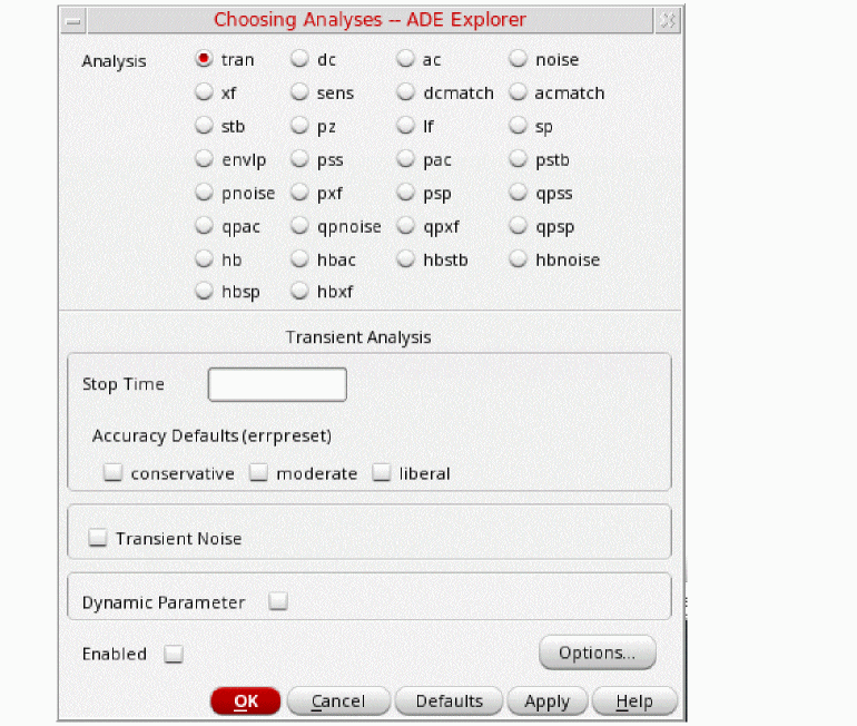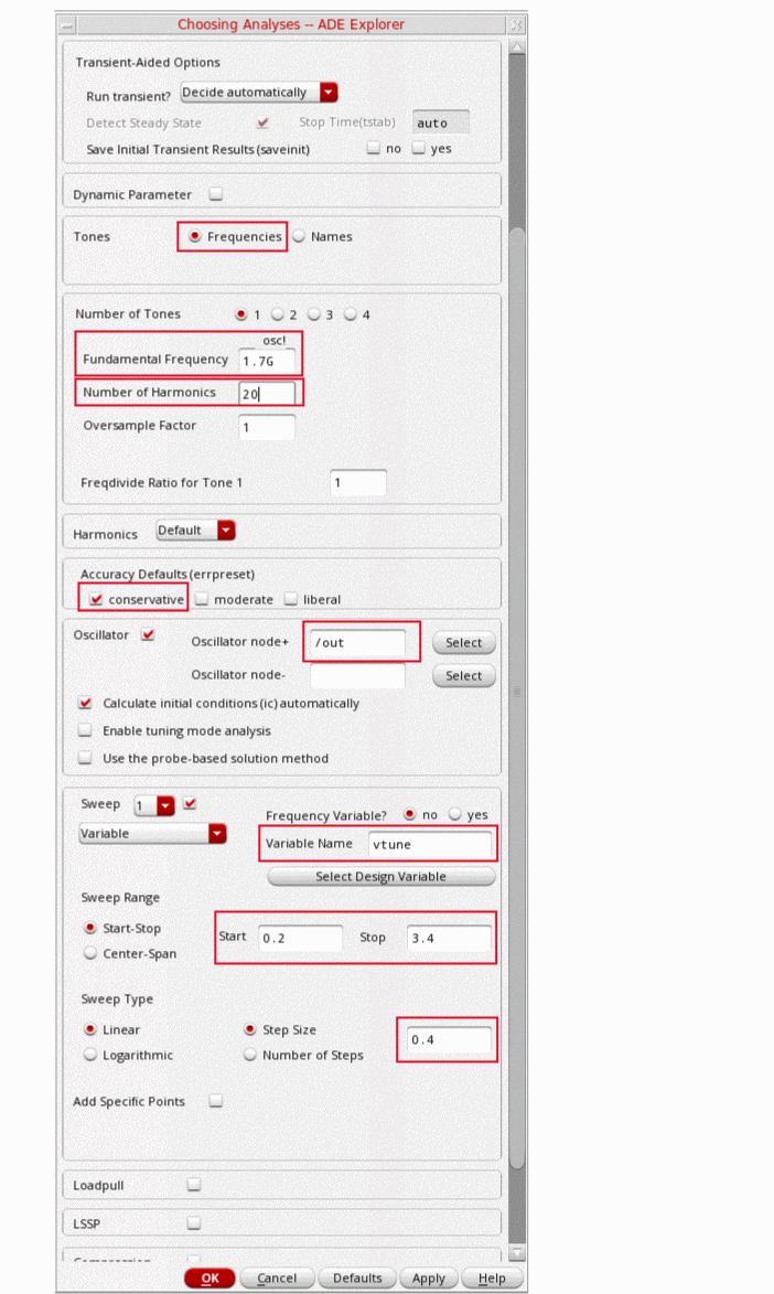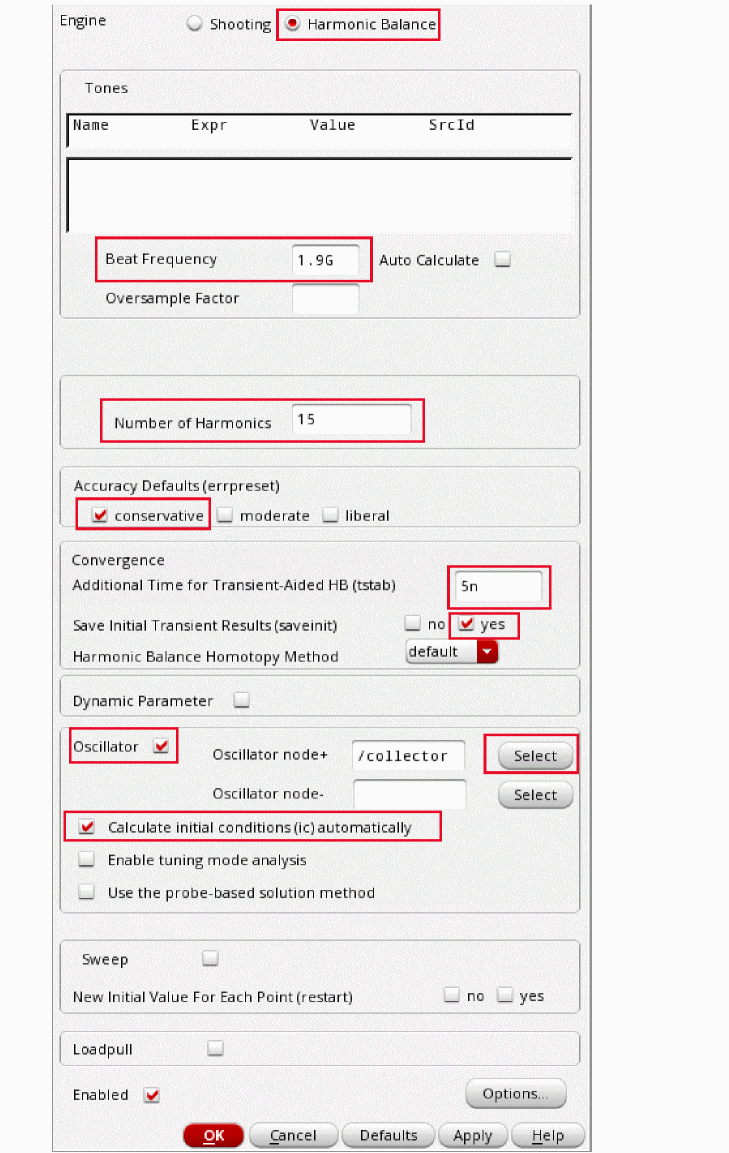 conservative is typically used because very small amplitude phase noise measurements are normally desired. conservative is recommended for all the oscillators. - Select yes for the Run Transient option.