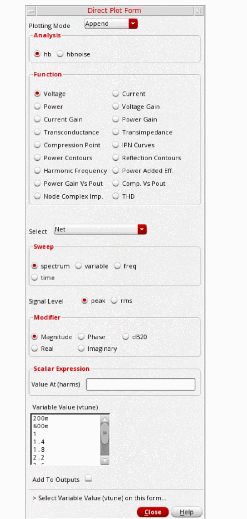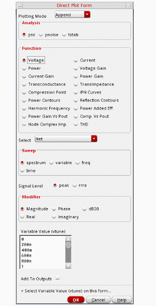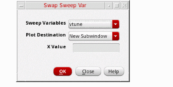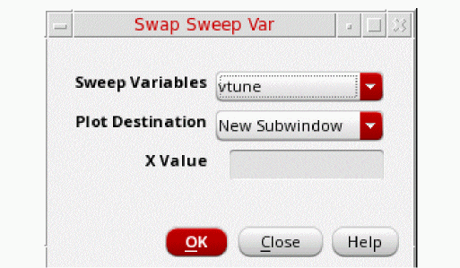 In Select Sweep Var dialog box which opens, select vtune from the Sweep Variables drop down list. Keep Plot Destination as New SubWindow.