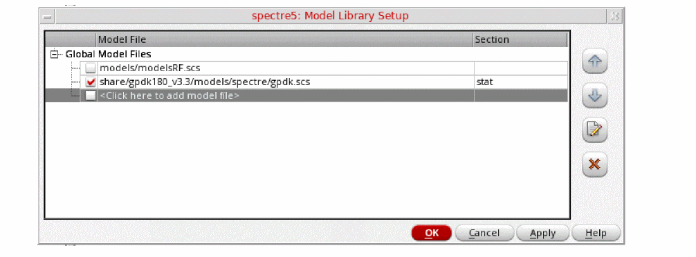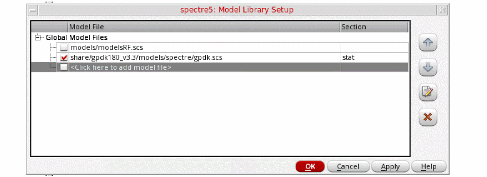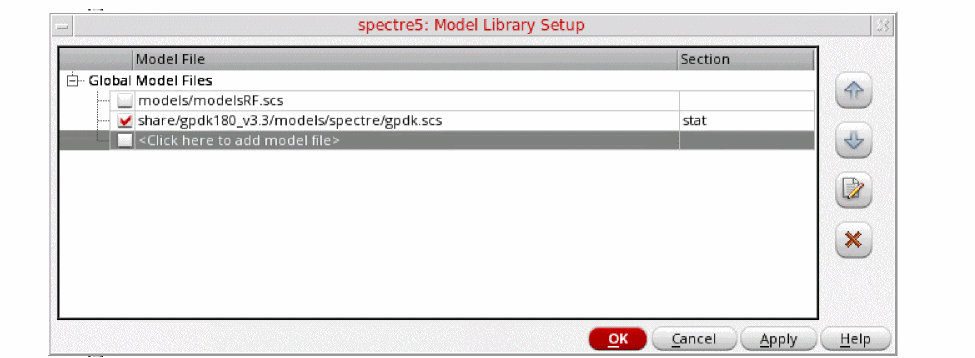 Figure 3-200 Model Library Setup FormYou can also browse to gpdk.scs file. Set the Section to stat.