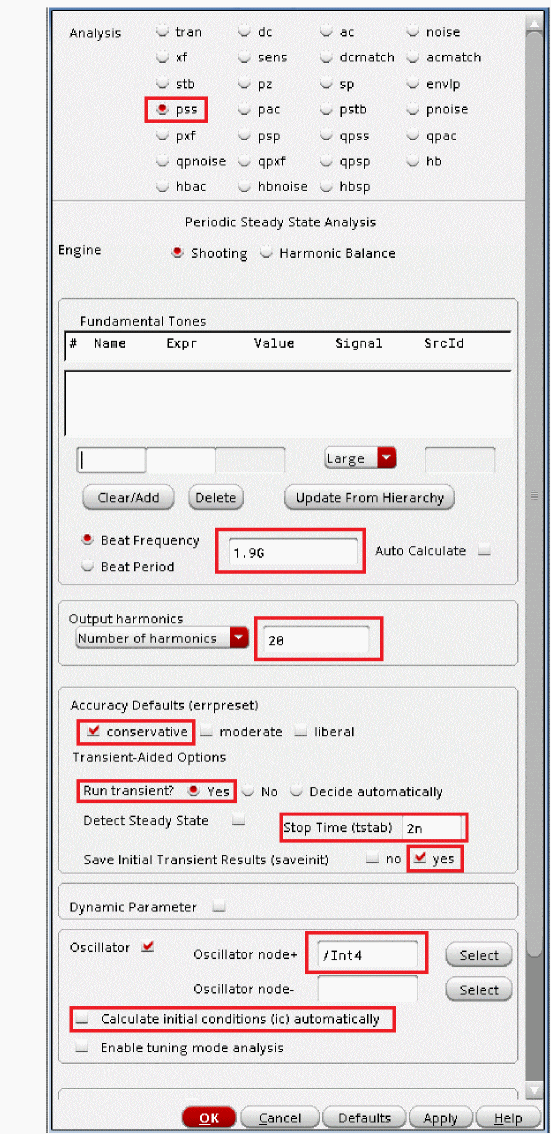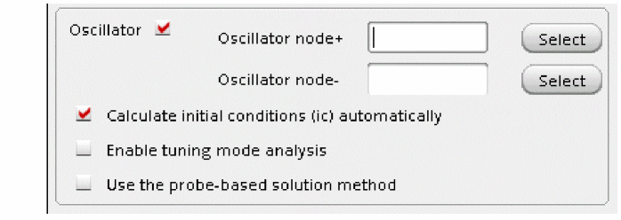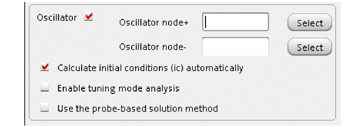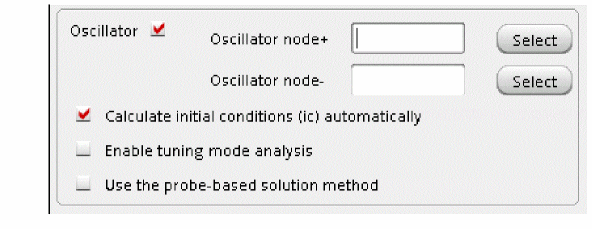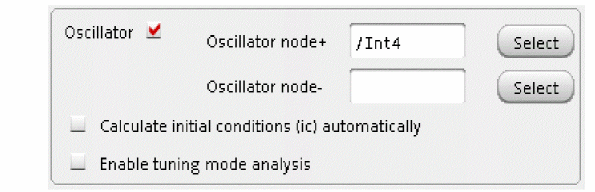 - If the Calculate initial conditions (ic) automatically check box is selected, then after the DC analysis for the time-zero timepoint has been calculated, the oscillator frequency and amplitude are estimated. The beginning of the transient analysis in the tstab interval includes this estimate.