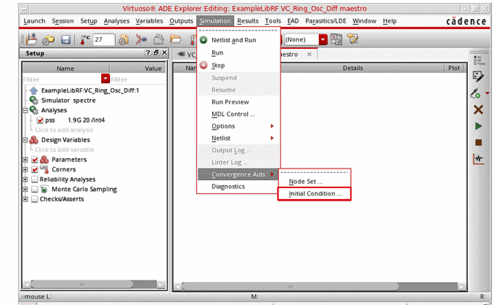 The stimulus should couple strongly into the oscillatory mode of the circuit and poorly into other long-lasting modes such as bias circuitry. This is usually done by adding a single pulse of current that is connected somewhere in the circuit to start the oscillations. - A set of initial conditions (ICs) for the components of the oscillator’s resonator.