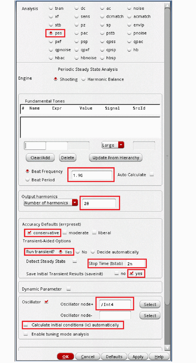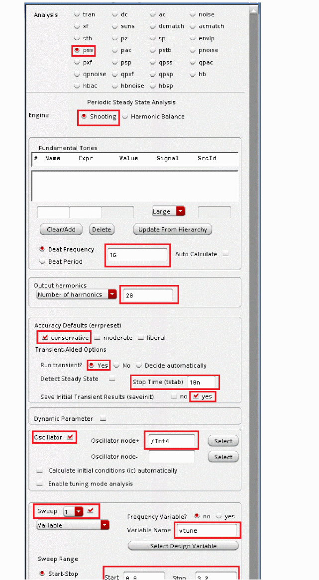 You cannot specify the analysis period for autonomous circuits because you do not know the precise oscillation period in advance of the simulation. Instead, you specify an estimate of the oscillation period for the simulation. The PSS analysis uses your estimate to compute the precise period and the periodic solution waveforms.