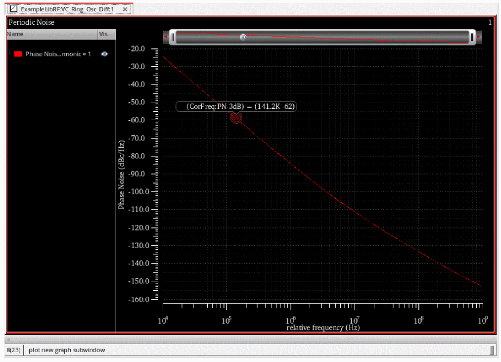 In the above plot, you have a graph of phase noise vs. relative frequency for each vtune sweep value. Next, you will modify the phase noise plot to provide more useful information.