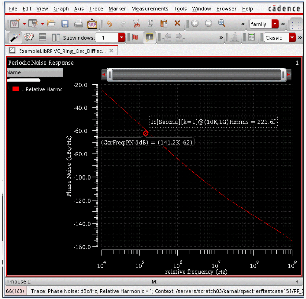 To summarize, PSS analysis using Shooting Engine and Pnoise was setup and simulation was run to determine the FM jitter of the oscillator.