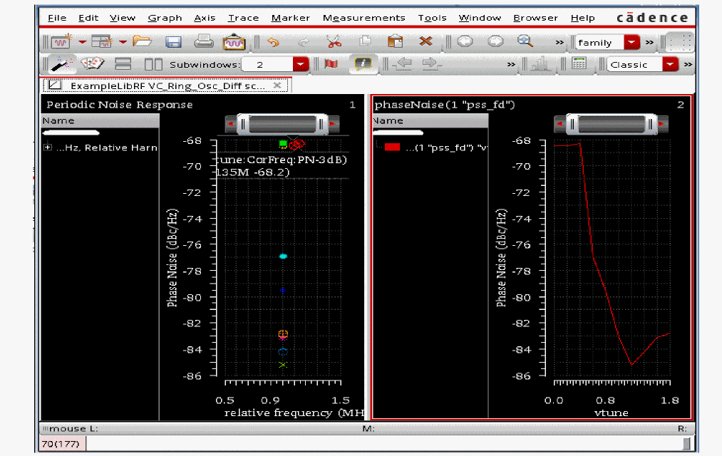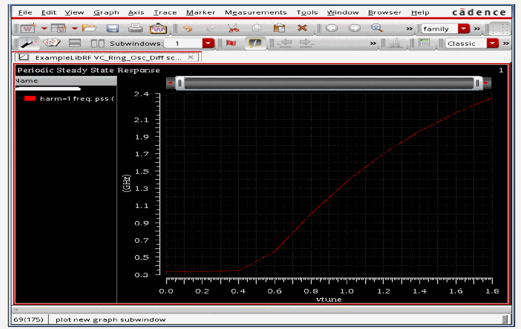 This example computes the swept periodic steady state solution using the shooting method for the VC_Ring_Osc_Diff oscillator circuit. You will sweep the tuning voltage to determine its effect on oscillation frequency. It then runs a periodic small-signal analysis pnoise to determine the phase noise of the oscillator. You perform a PSS-Shooting analysis first because the periodic steady state solution must be determined before you can perform any other periodic small-signal analysis, such as pnoise pxf to determine phase noise or transfer function and so on.