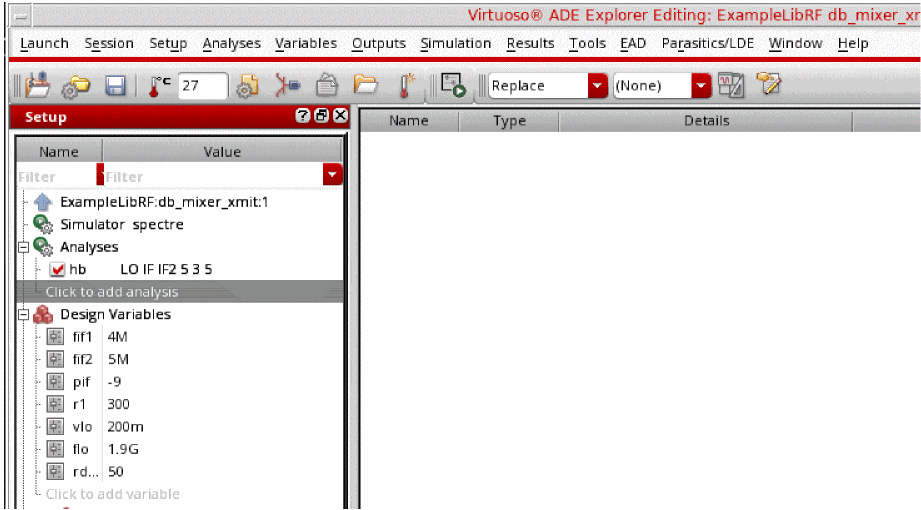 Select Analyses –> Choose in the Virtuoso Analog Design Environment window.